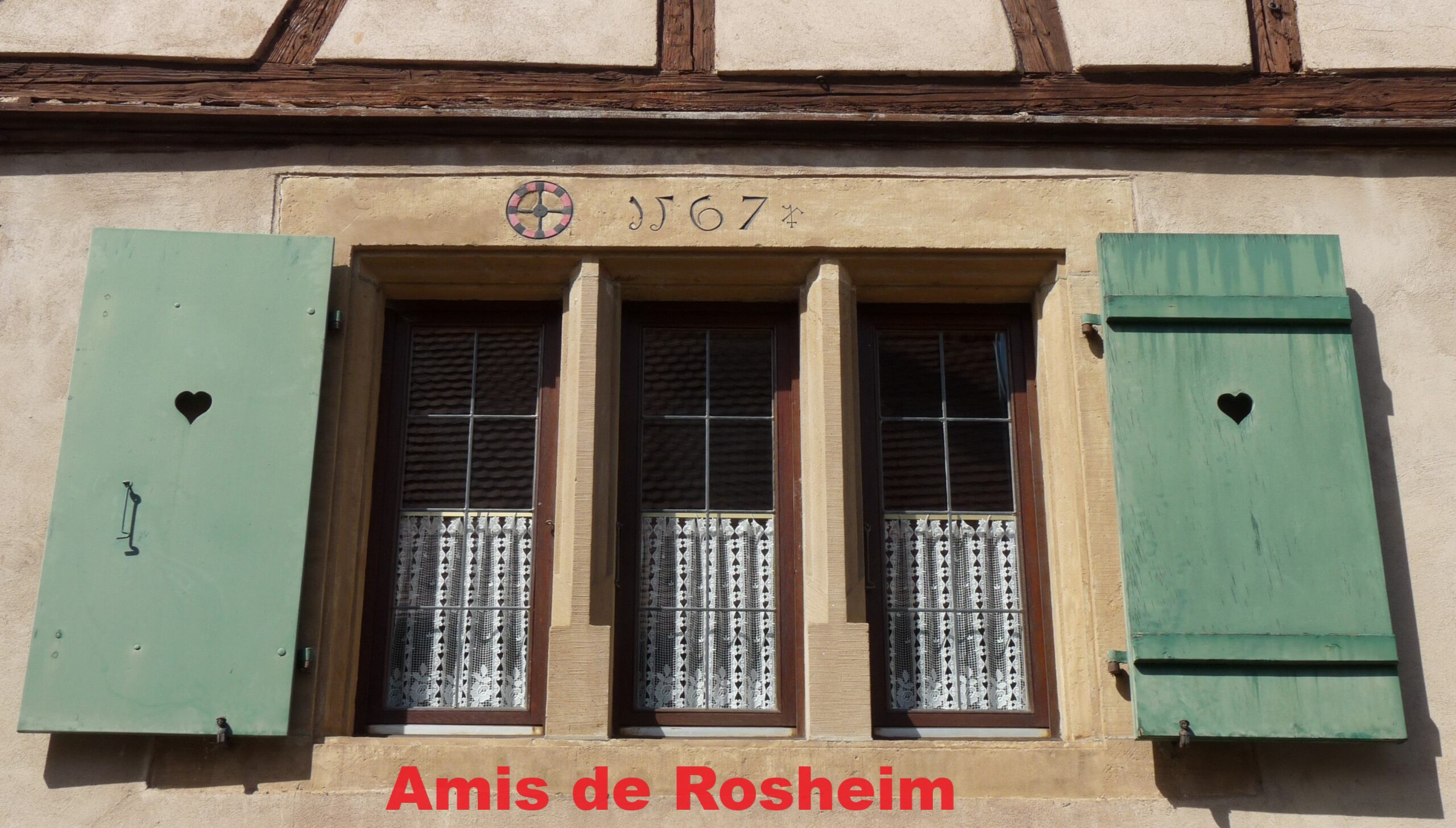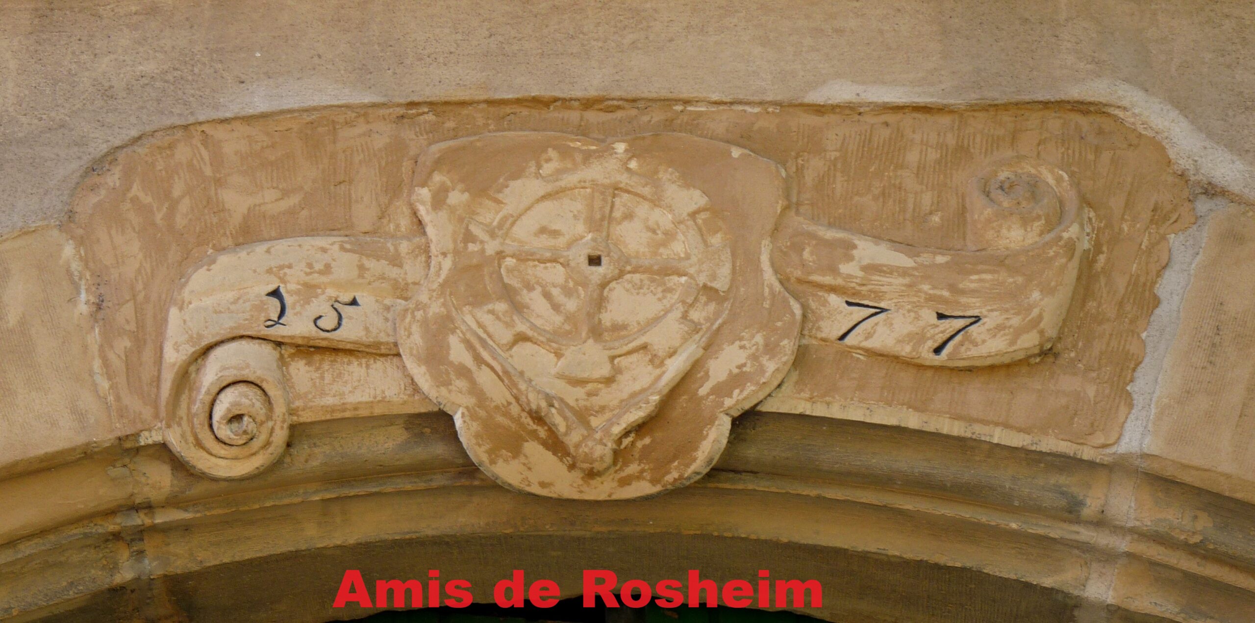 4 – L’emblème de meunier (roue de moulin) figure sur le linteau de la fenêtre à trois battants de la façade. Des traces de peinture rouge découvertes lors de l’enlèvement du crépi en 1980 ont permis d’en restaurer la polychromie.