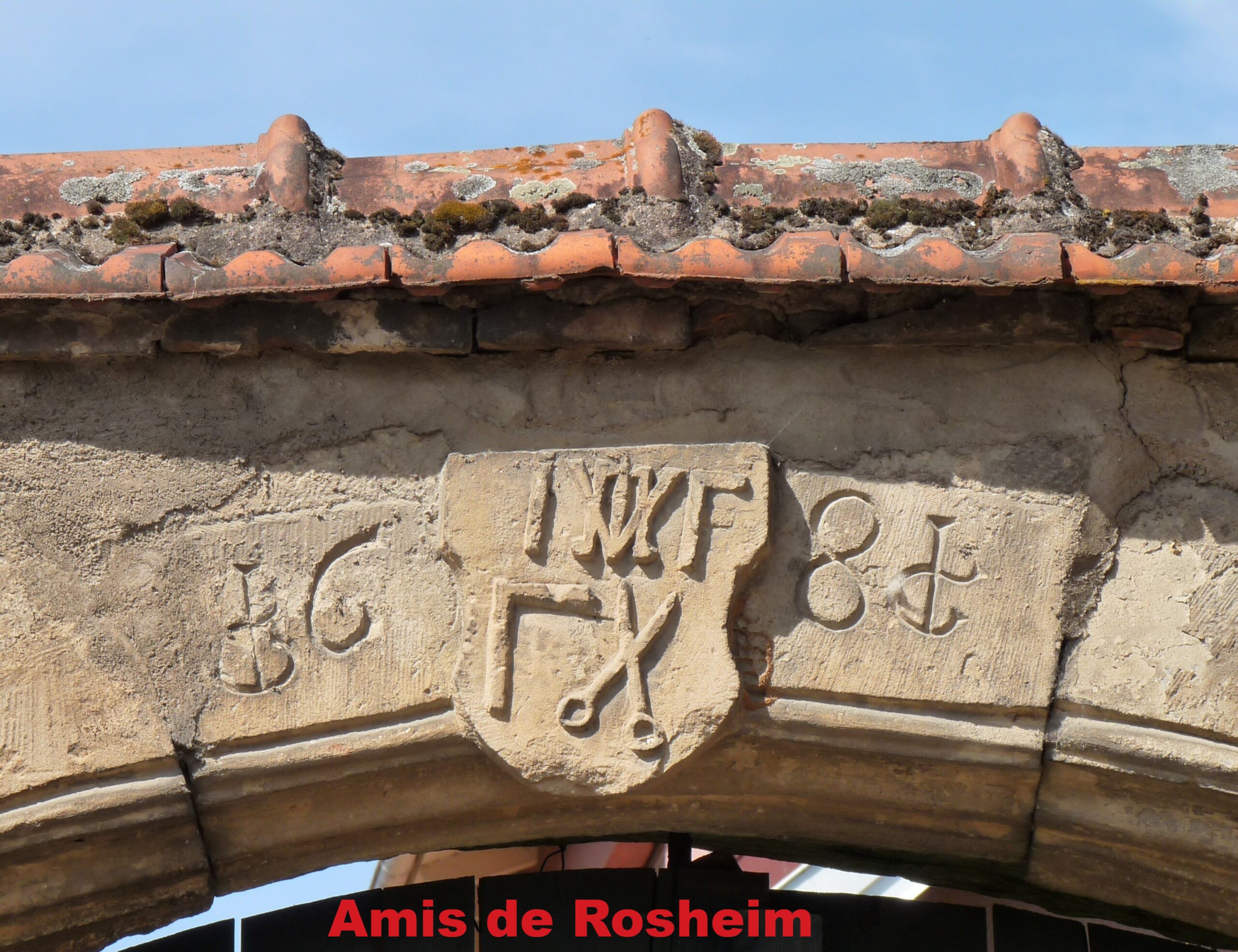 5 – A l’angle de la rue Braun avec l’avenue Clemenceau, un portail dont la clé d’arc porte la date de 1681 donne accès par la rue Braun au n° 46, avenue Clemenceau. La clé d’arc porte un emblème de chirurgien-barbier. On reconnaît un rasoir entr’ouvert et une paire de ciseaux surmontés de trois instruments servant à pratiquer la saignée : une lancette et deux flammes. De part et d’autre figurent les initiales I F du propriétaire. On retrouve sur un linteau de fenêtre du 85, rue du Général de Gaulle, daté de 1688, les mêmes initiales et la représentation très stylisée de la lancette. Il s’agit de l’emblème de Iohannes Furst (mort en 1707), bourgmestre, chirurgien, beau-frère du greffier Grau.