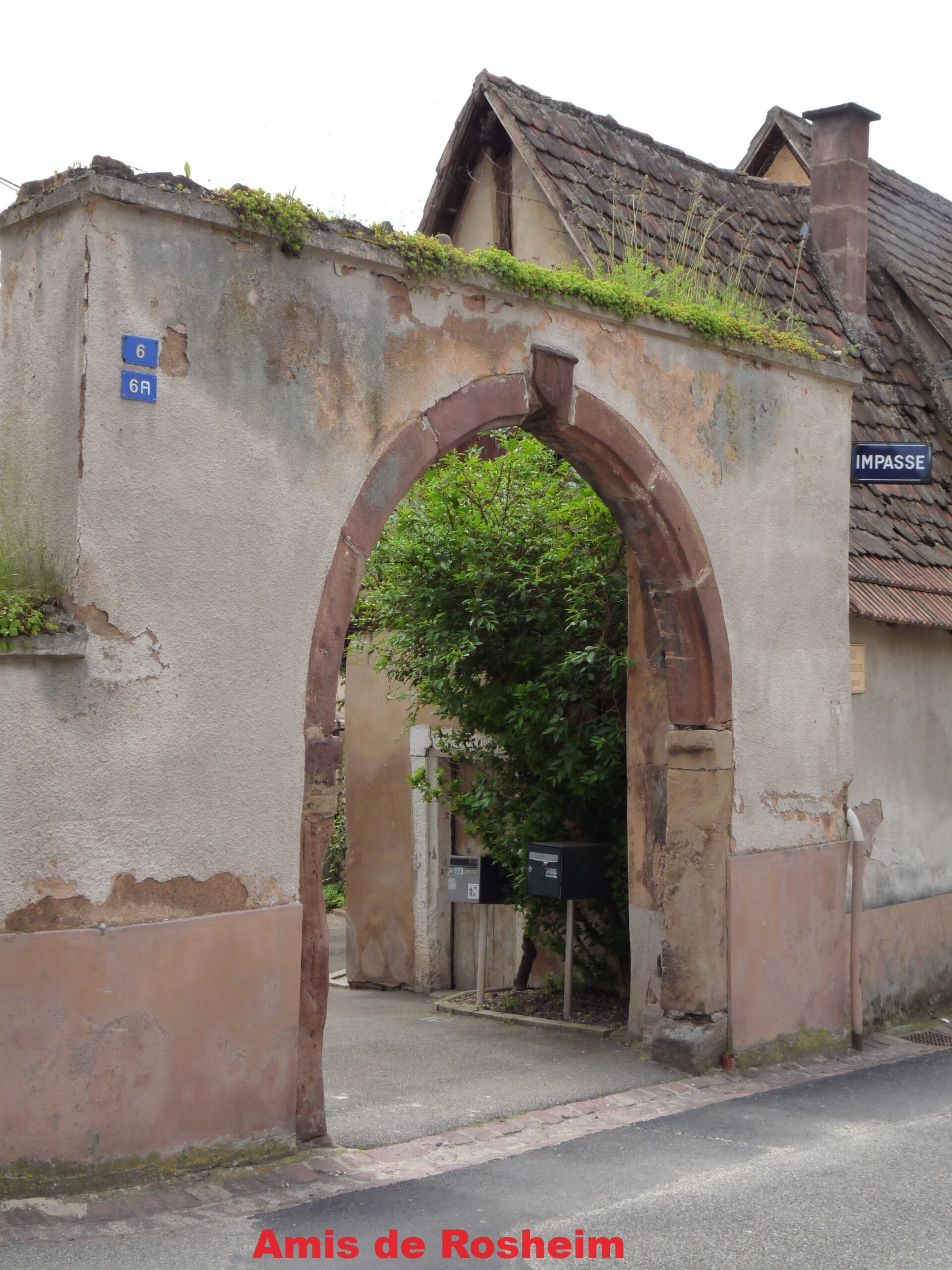6 – L’emblème de boulanger en grès rouge sur le porche du numéro 6 est très stylisé. Le portail n’est pas daté mais le grès utilisé, l’appareillage des pierres et la présence d’un clausoir (dernière pierre à l’extrémité d’une voute) font penser à un portail pré-Renaissance voire médiéval. L’emblème peut avoir été retaillé par la suite ce qui expliquerait qu’il soit taillé en creux. Il représente un bretzel et une miche de pain.
