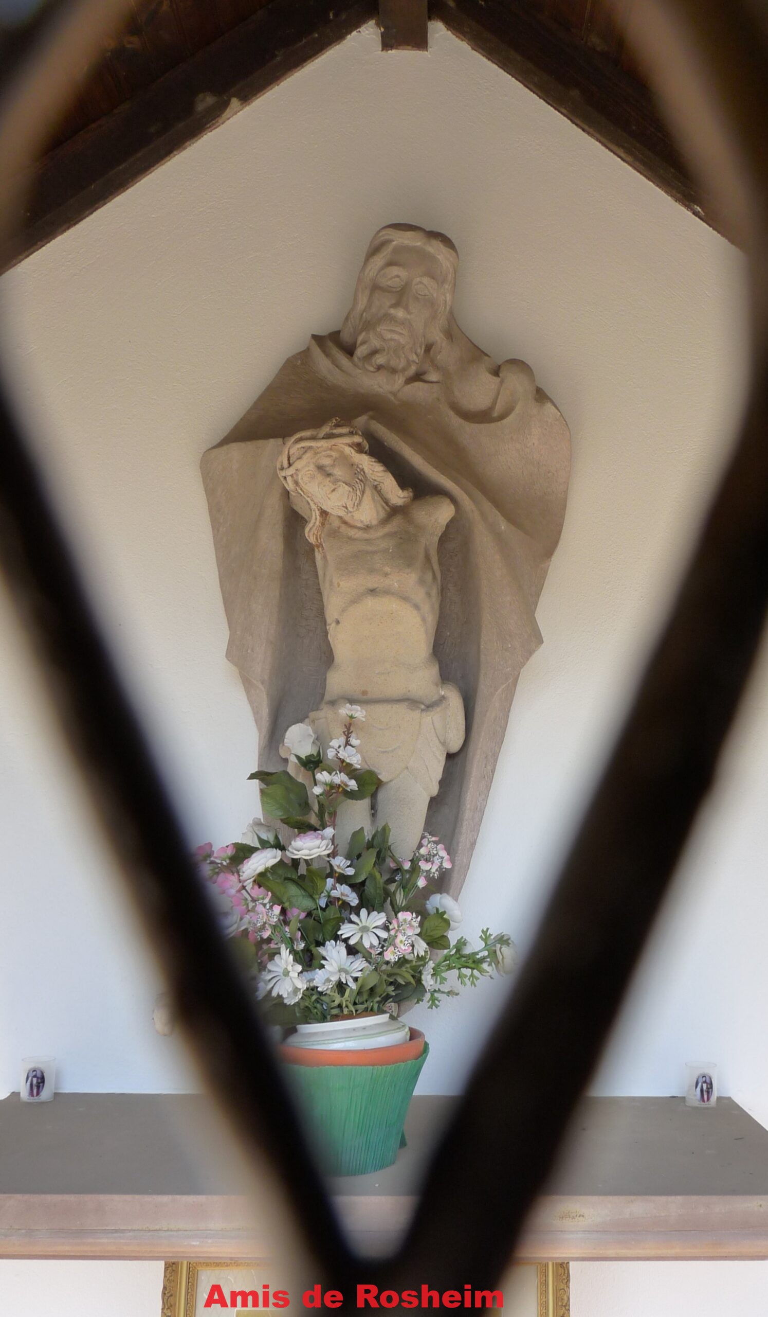 5-6 : à l’intérieur de la chapelle : une sculpture et un autel intégrant des fragments de la croix (édifiée en 1804 à la demande d’Odile Gyss, l’épouse de Joseph Troestler, le censier de Haute-Seille) qui fut accidentée en 1973. Le groupe statuaire « La Sainte Trinité » en grès gris-rouge provenant des carrières de Bust a été réalisé en 1976 par Raymond Keller.