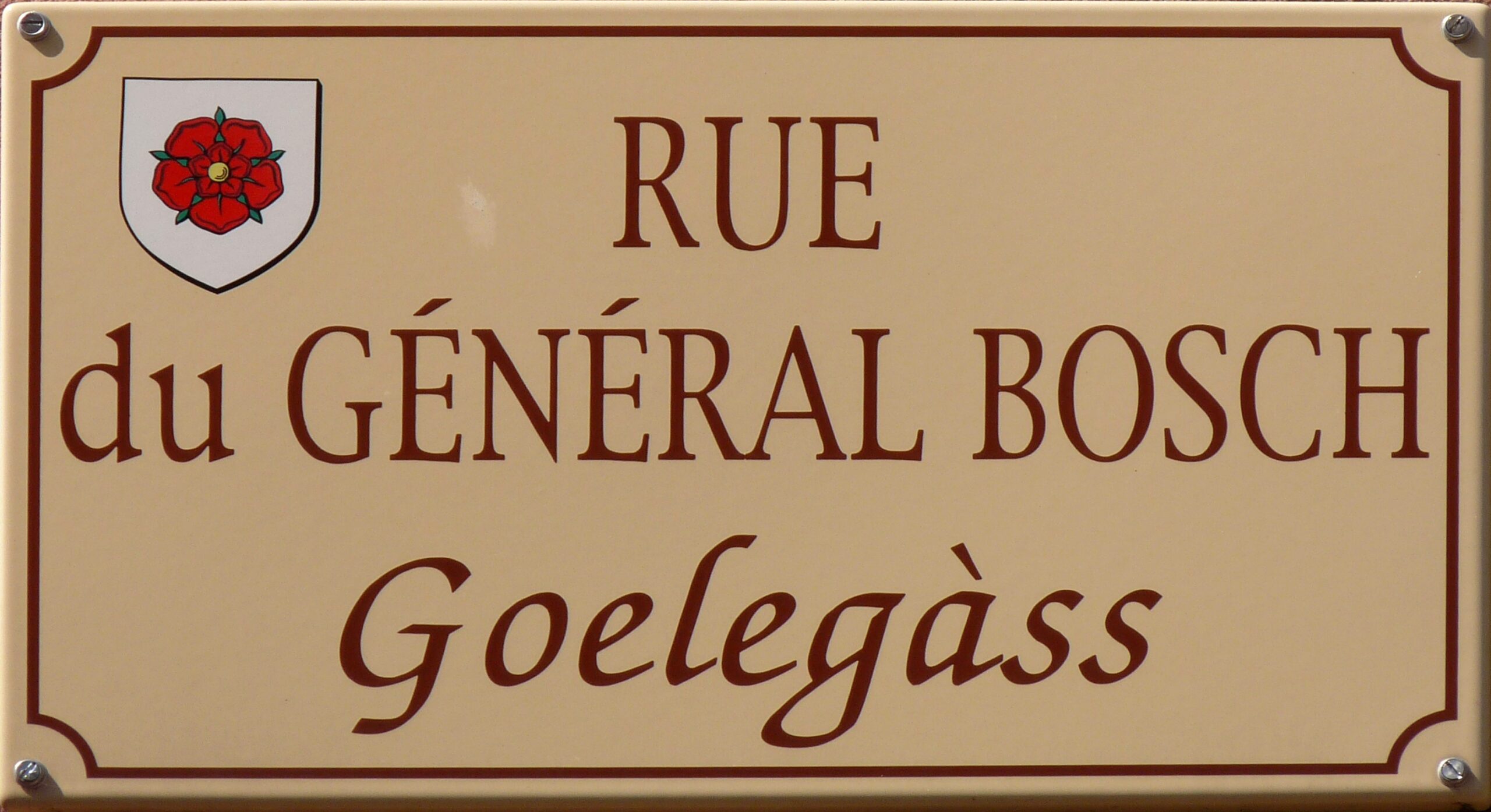 La Goelegàss (ou Geulen Gasse) est devenue rue du Général Bosch après la francisation des noms de rues au retour de l’Alsace à la France après 1918. Le général Edgar Bosch, fils du notaire Bosch de Marmoutier, notaire à Rosheim jusqu’en 1866 est né à Rosheim en 1854 mais quitte définitivement Rosheim en 1865.