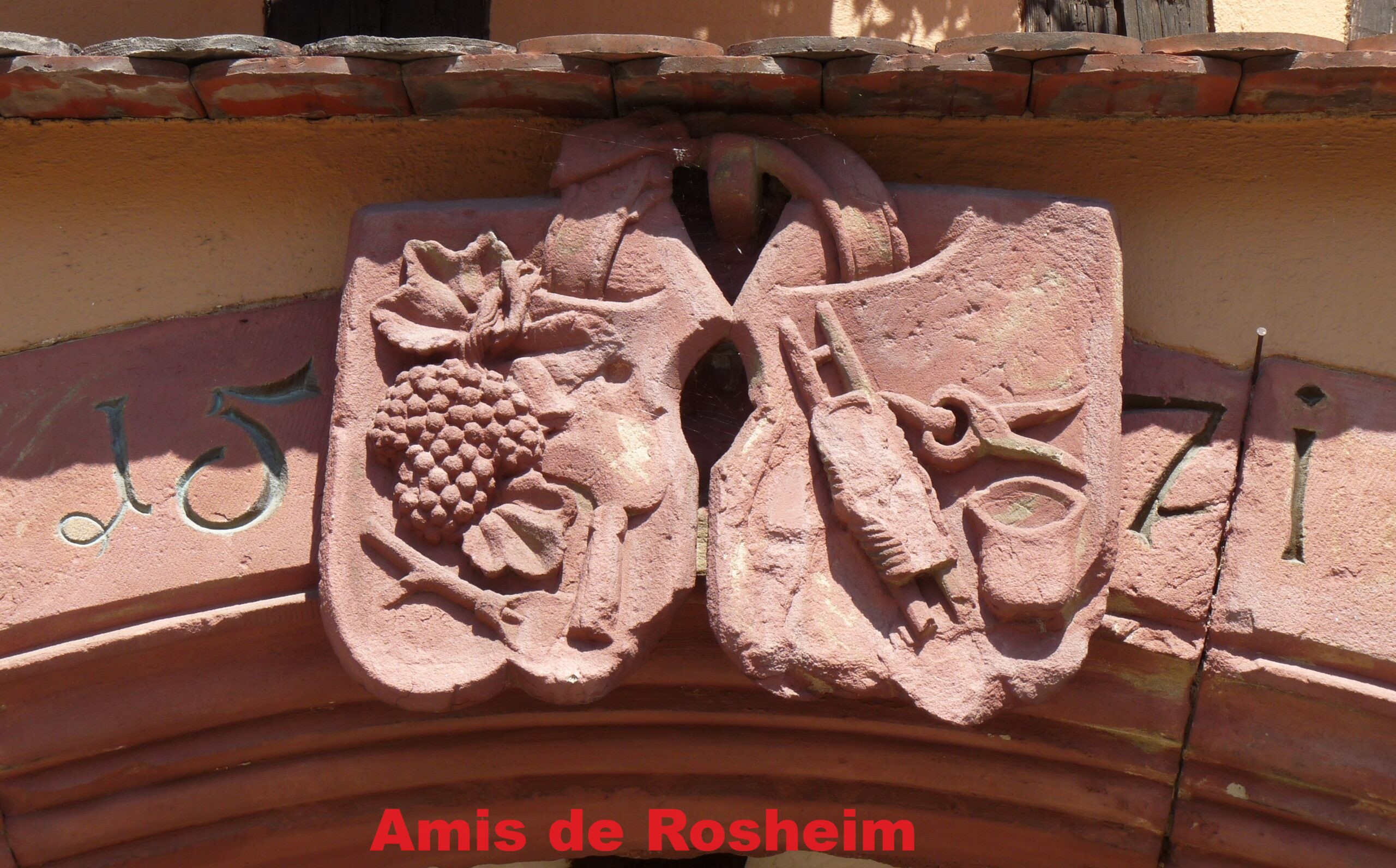 2 – Au dessus de la porte charrière en plein cintre dont l’encadrement est mouluré, la clé d’arcade ornée de deux écus accolés reliés par une lanière imitant le cuir. L’écu de gauche est décoré des emblèmes du vigneron serpette, curoir de soc de charrue branche de vigne avec grappe et feuilles. Celui de droite se rattache au métier de gourmet qui à cette époque était chargé du contrôle de la qualité des vins : échelle pour glisser les tonneaux, gobelet et tenailles.