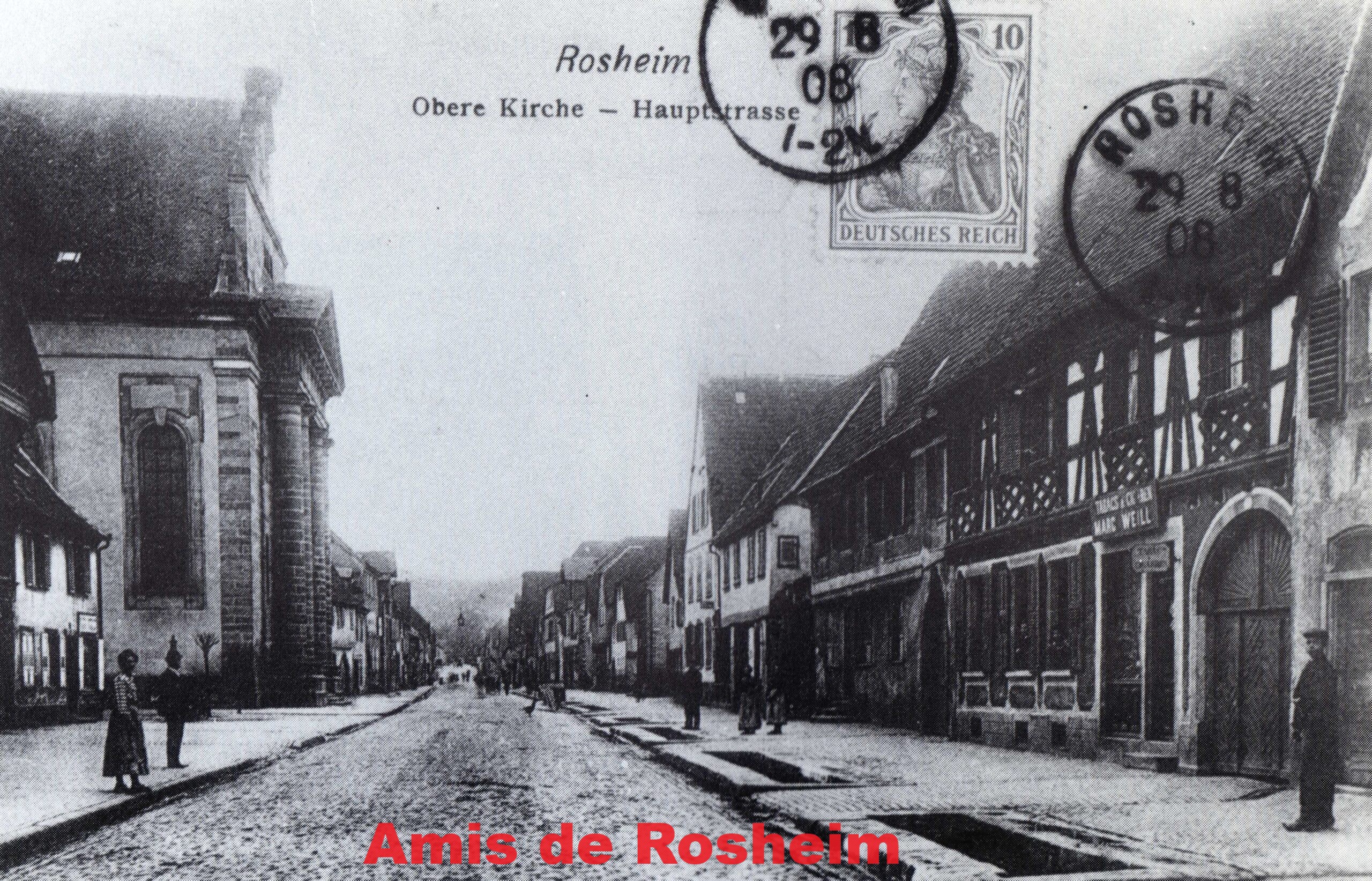 8 – Cette carte postale, expédiée en 1908, donne une vue d’ensemble de la ville. En face de l’église Saint-Etienne, la grande maison du numéro 57, le café A la ville de Paris. La rue principale était encore pavée et le « Bach » (Rosenmeer) encore bien visible.