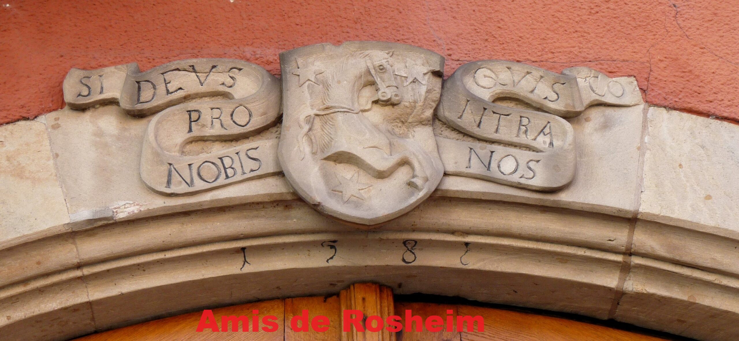 8 : Au numéro 50 : magnifiques armoiries d’une famille inconnue arborant, comme les nobles, un emblème ne se référant ni à un métier ni à une ligne de noblesse. Le porche daté de 1582 avec une citation latine  extraite de la bible : « SI DEUS PRO NOBIS QVYS CONTRA NOS (Si Dieu est avec nous, qui sera contre nous – épître de Saint Paul aux Romains, 8, 31) »