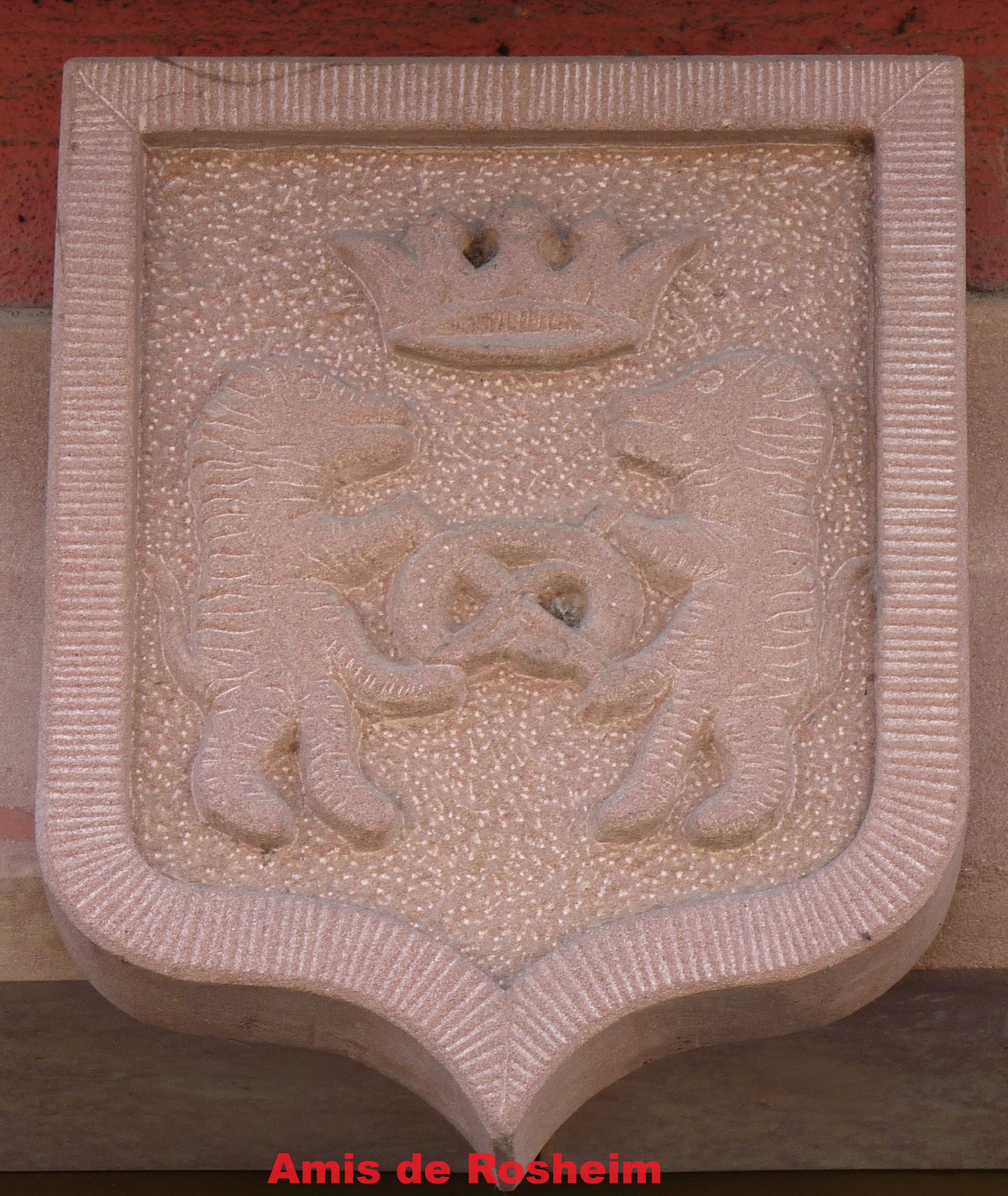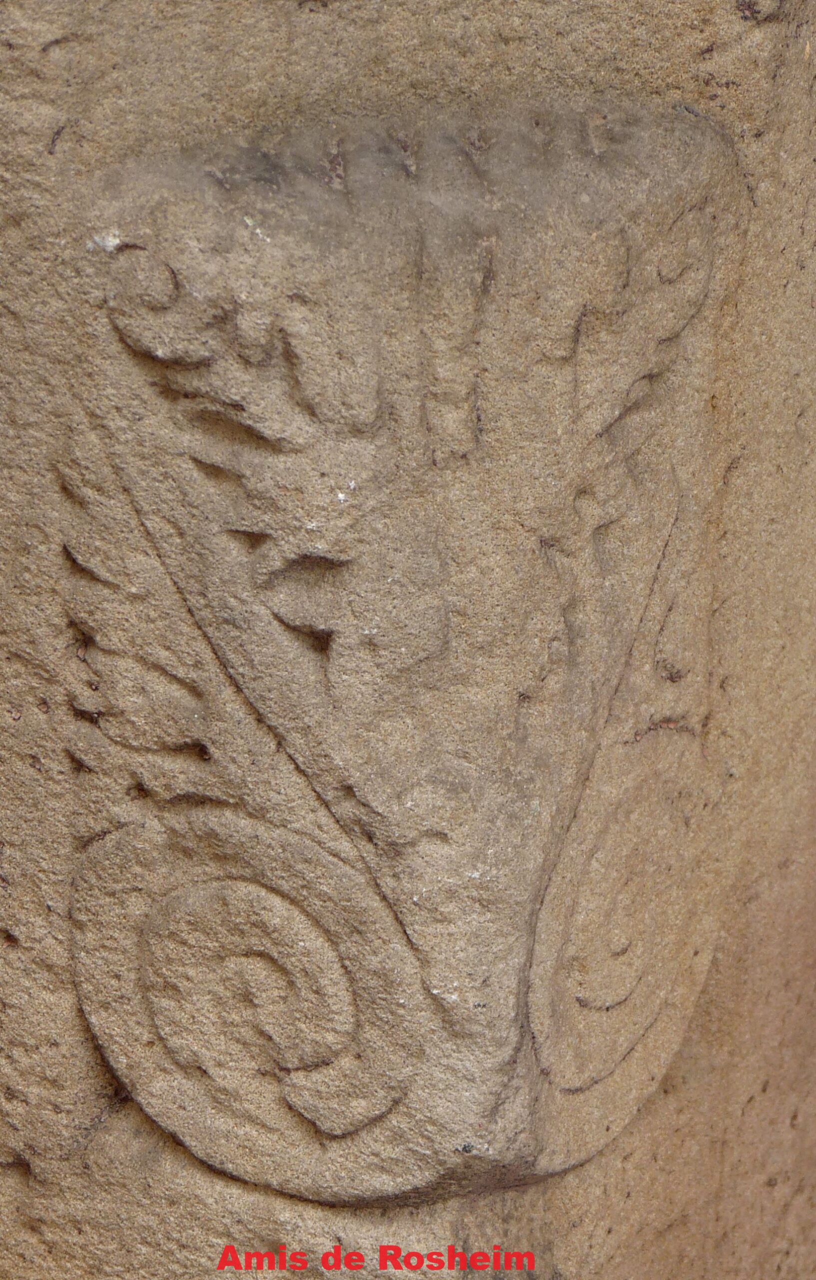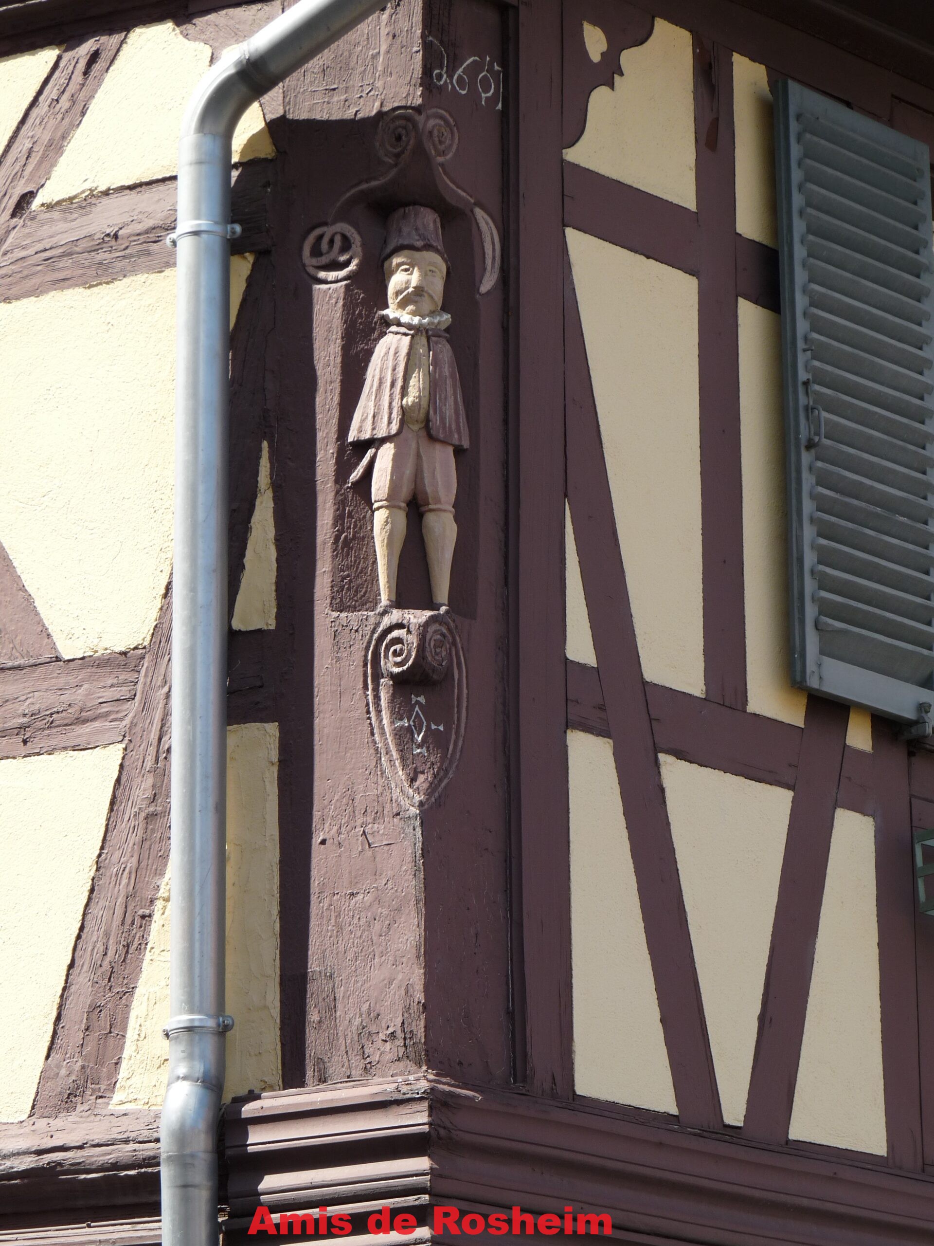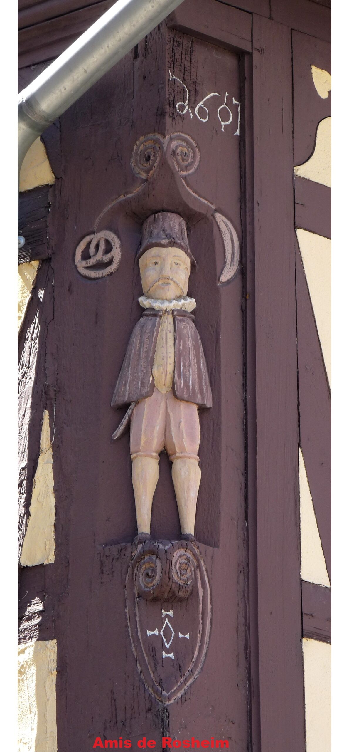 3 – Détail du personnage avec son couvre-chef en forme de cône tronqué, sa moustache imposante, une fraise autour de son cou, une ample pèlerine laissant dépasser une épée courte, culotte bouffante serrée sous le genou. Le port d’une épée au côté signifie qu’il s’agit probablement d’un bourgeois de la ville. De part et d’autre de sa tête on trouve les emblèmes du boulanger, bretzel et pain. Plus haut à droite est gravée la date 1602 et on devine les initiales MW – BA du propriétaire et de son épouse.