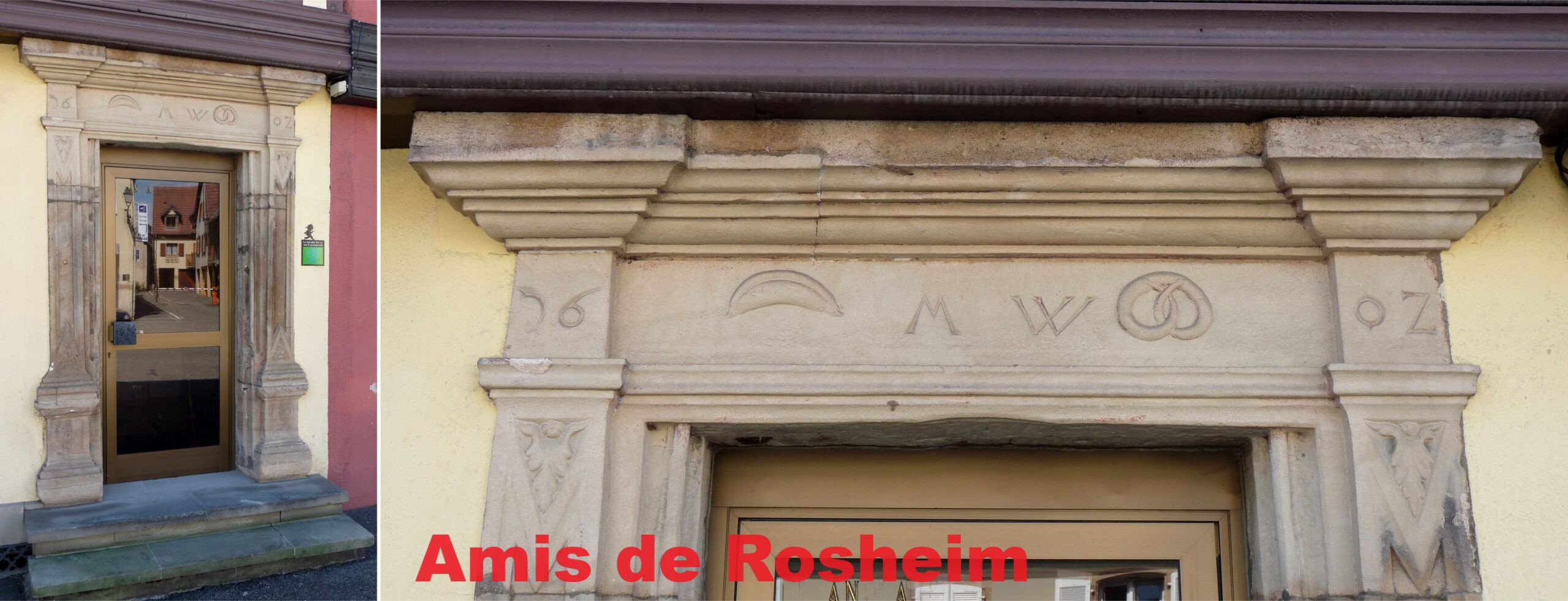 4 – L’encadrement de la porte d’entrée est constitué par un corps de moulures couronnant le linteau qui repose sur deux pilastres ornés au sommet et à la base de motifs feuillagés en triangle. Sur le linteau, les emblèmes de boulanger : miche de pain et bretzel, la date 1602 et les initiales du propriétaires et de son épouse.