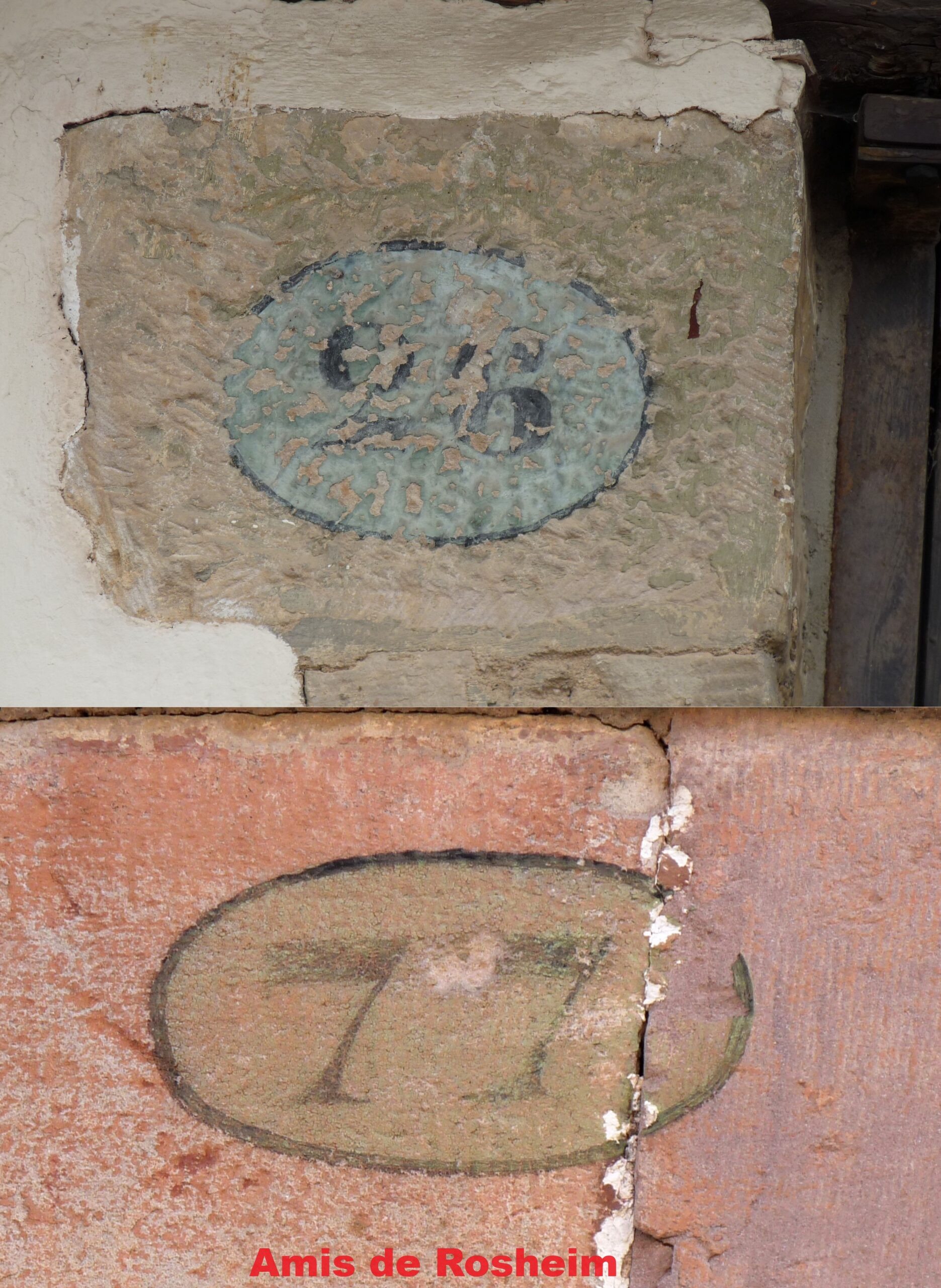 6 – Les anciens numéros de maison étaient peints sur un fond de couleur correspondant aux 4 quartiers de la ville. Au numéro 35 (en haut du pilier gauche du porche) l’ancien numéro 25 sur fond bleu, nous sommes encore dans le quartier bleu (Wallgarth Viertenteil). Au numéro 45 l’ancien numéro 77 sur fond vert, nous sommes dans le quartier vert (Löber Viertenteil).