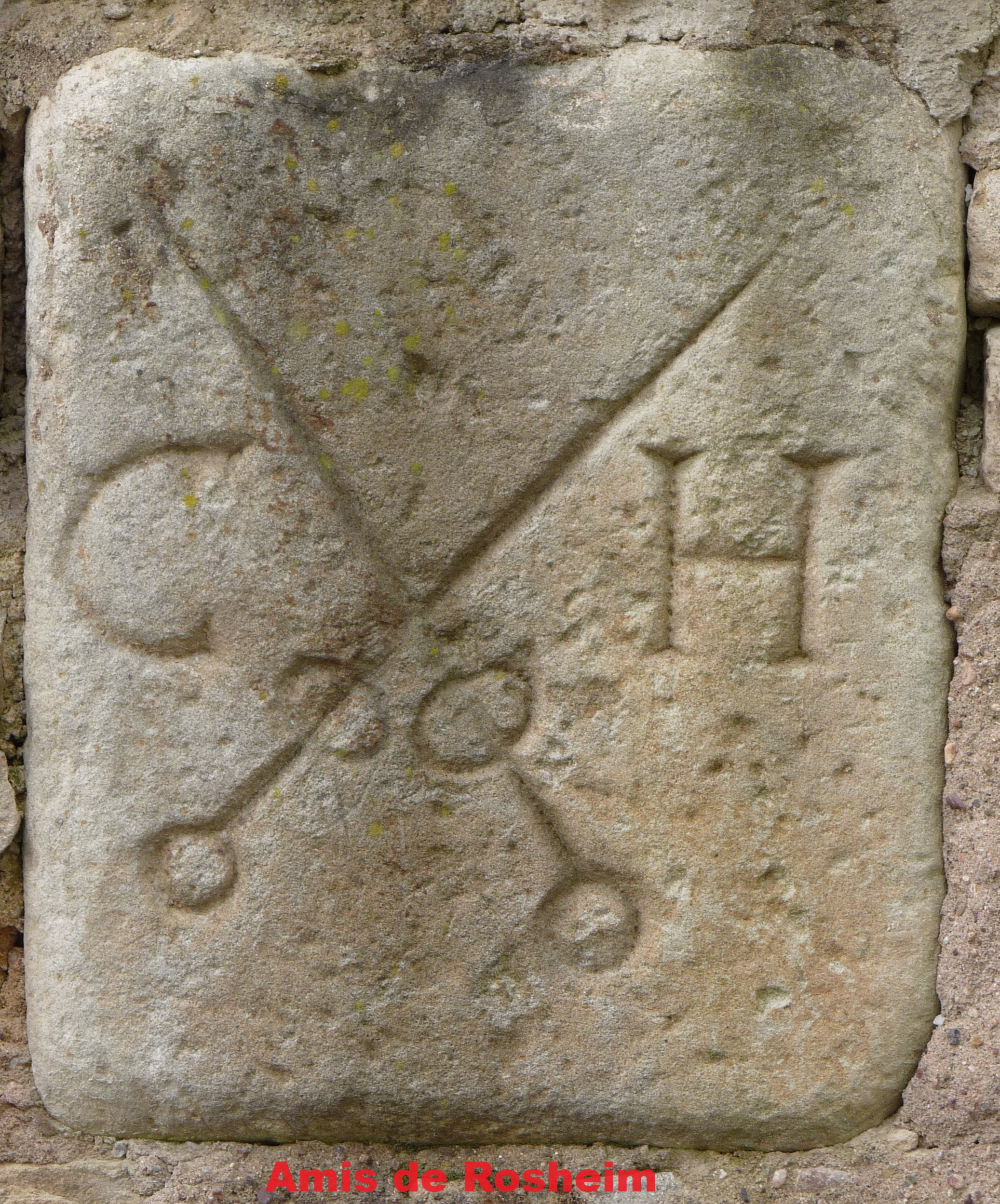 8 – Une pierre gravée est intégrée dans le mur du numéro 7 avec les initiales C H entourant deux piques.