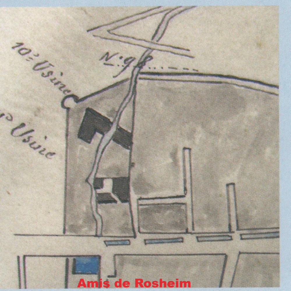 2 – Ce plan de 1859 nous apprend qu’à la fin du XVIIIe siècle, deux moulins dont un à huile fonctionnaient dans cette rue. Celui situé le plus au Nord, à l’emplacement de l’actuel numéro 9 était le moulin à farine dit Obermühle. Celui au bas de la rue, au numéro 3 était un moulin à huile. On voit clairement sur ce plan le cours du Rosenmeer venant du Nord et faisant, au bas de la rue, un angle droit pour suivre le tracé de la rue principale.