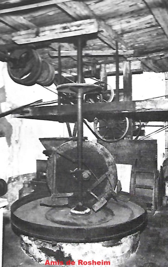 4 – Photo ancienne du moulin à huile, la roue hydraulique verticale a été installée au XIXe siècle, après 1829. Les bâtiments sont acquis à la fin du XIXe siècle par Charles Boff qui fait transformer le logis. En 1905, un moteur électrique est installé car la force hydraulique du Rosenmeer n’était pas toujours suffisante. En 1918, son fils Joseph prend la relève, mais souvent sur la route étant aussi marchand de porcs et porcelets, c’est son épouse Ernestine qui s’en occupe. Le moulin cessera de fonctionner en 1958.