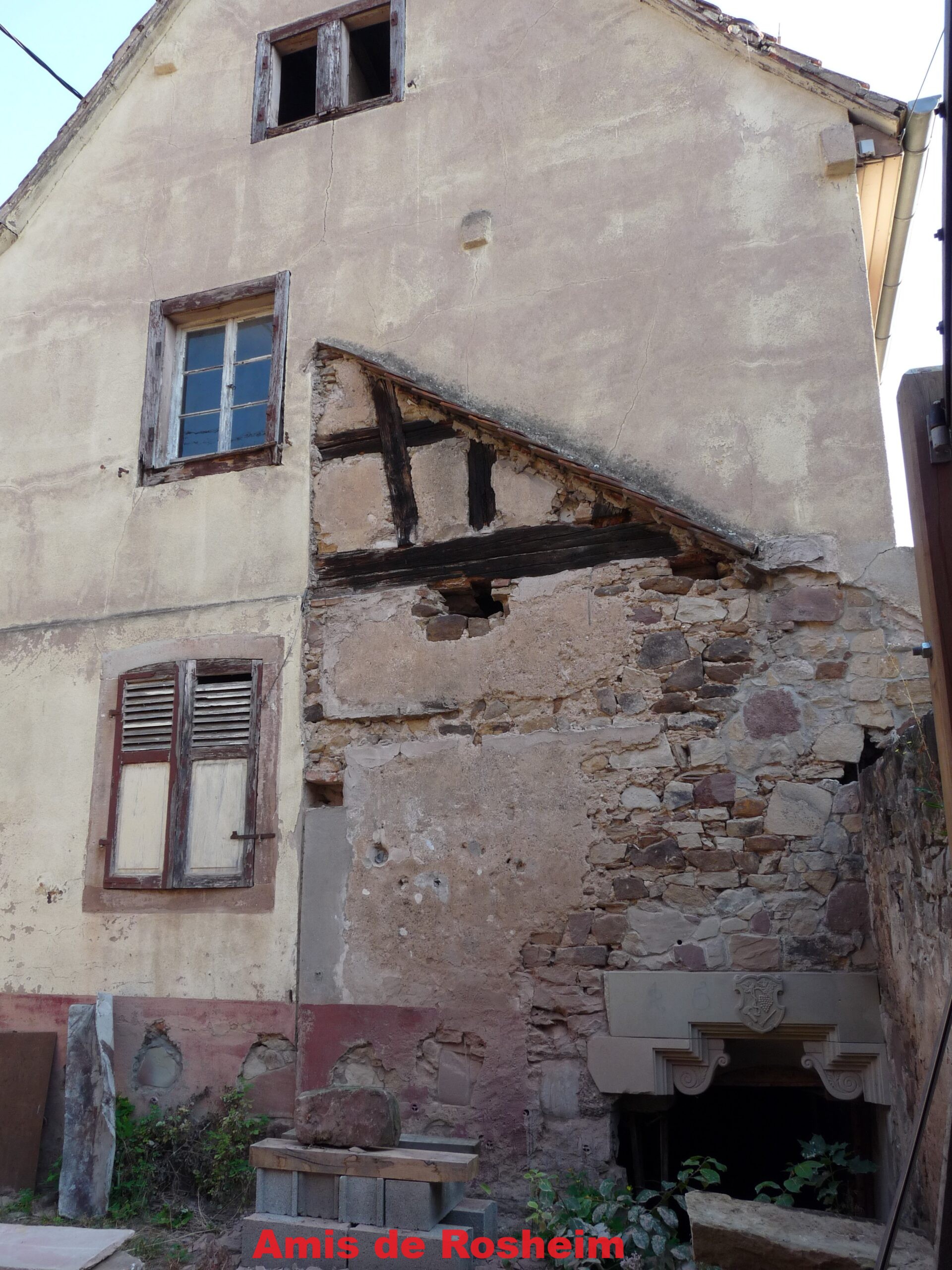 2-3-4 : sous le crépis du numéro 17, la structure de la base en pierre et le départ des pans de bois, l’ancienne porte d’entrée réhabilitée avec son emblème métier de vigneron.