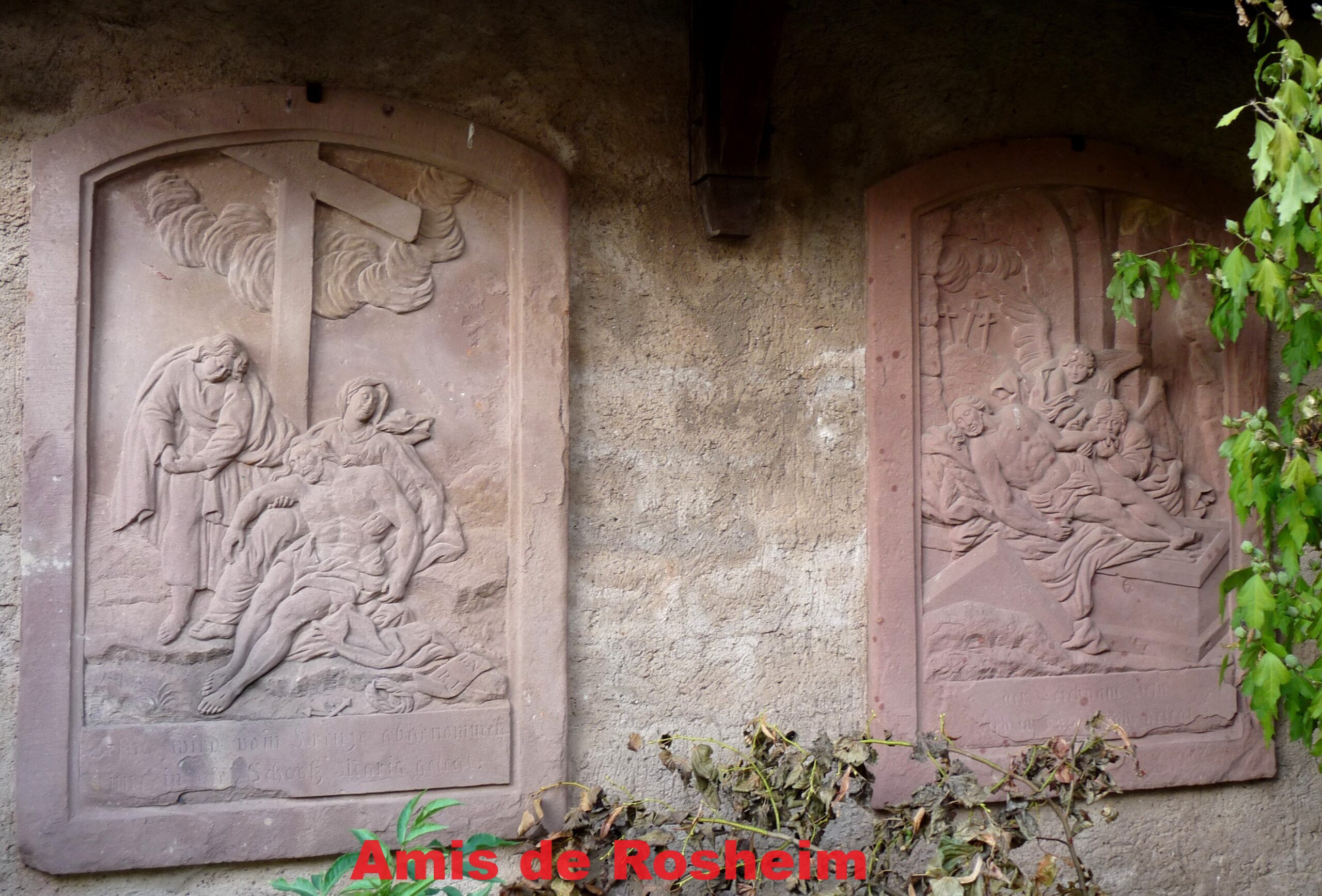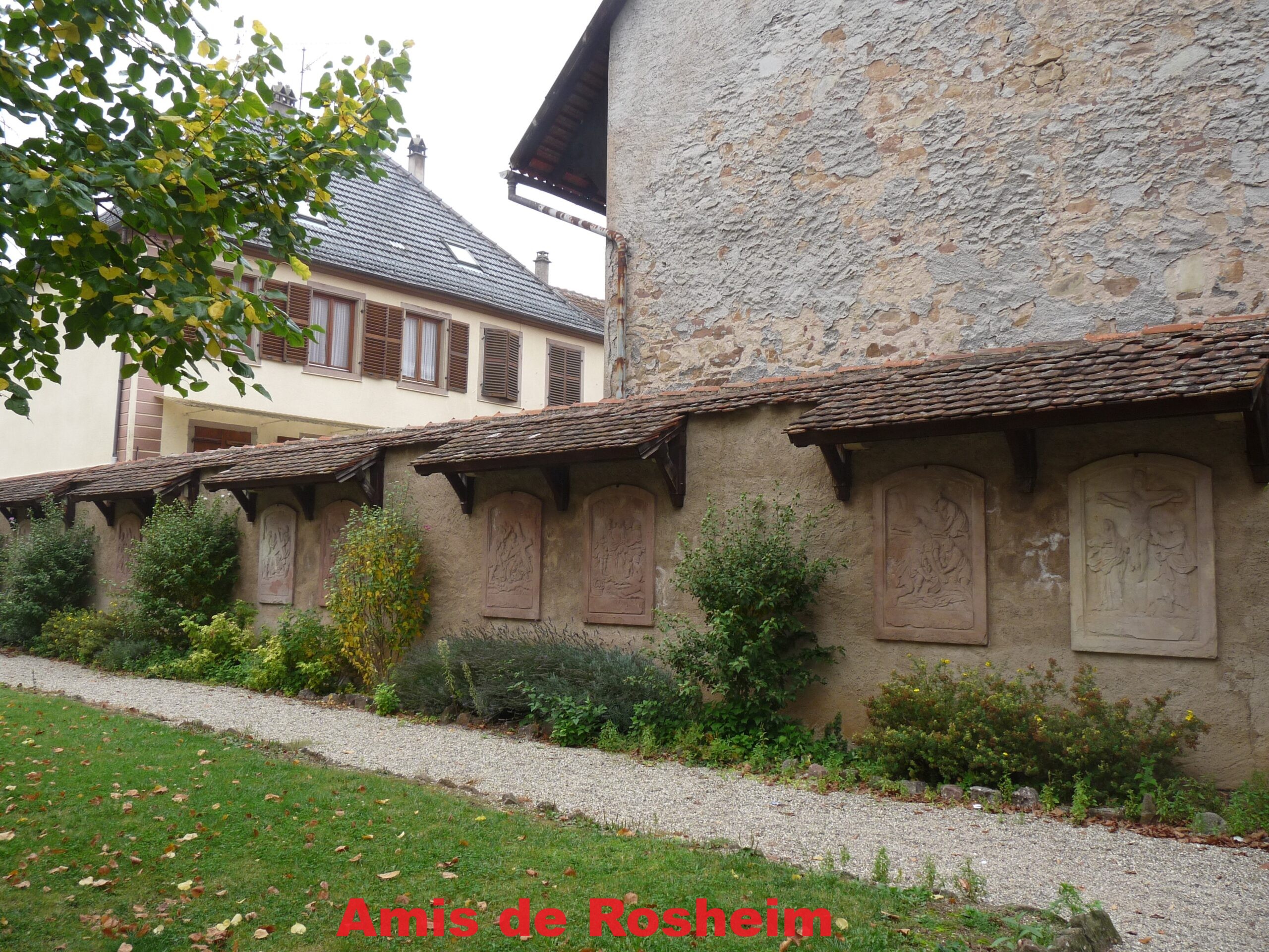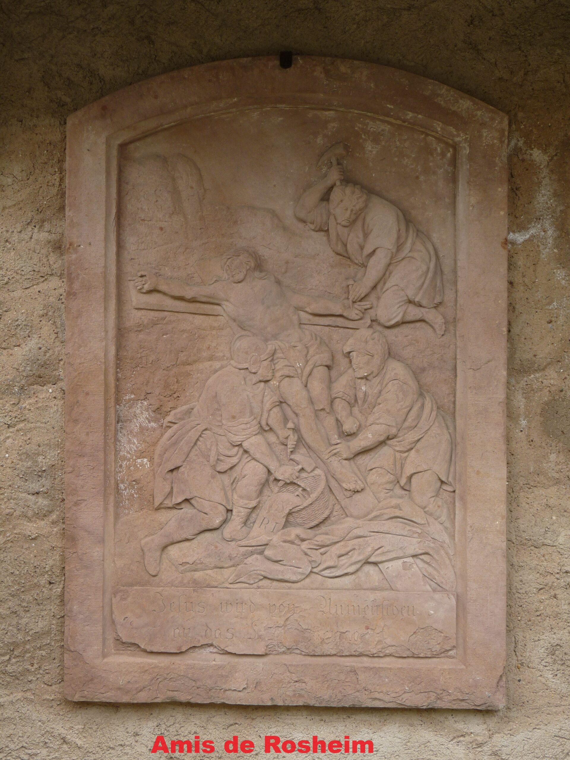 3-4-5 : Le chemin de croix du XIXe siècle réalisé à l’initiative du curé Jean-Baptiste Raess était autrefois placé dans un enclos, une allée menant à la chapelle. Les panneaux étaient placés sur les murs de part et d’autre. Aujourd’hui, ces panneaux figurent tous sur le mur de la propriété voisine. Il est constitué de 14 panneaux en bas relief réalisés en 1833 par Dominique Hubert, sculpteur à Obernai.