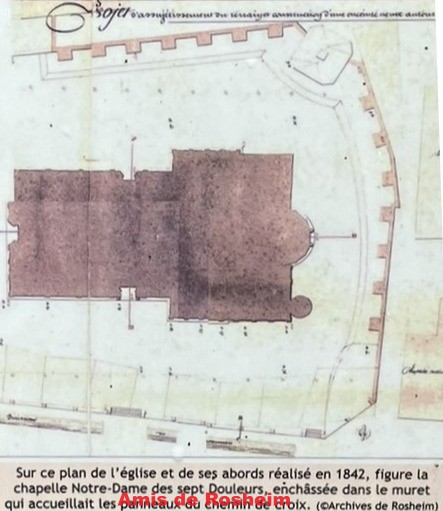 2 – Plan d’implantation de la Chapelle Notre-Dame des Sept Douleurs et du chemin de croix. Ce plan de 1842 situe la chapelle au milieu du chemin de croix et révèle sa forme d’octogone irrégulier pour s’insérer dans les constructions existantes. Sur ce plan figurent encore les bâtiments au sud de l’église le long de la rue principale qui n’ont été détruits qu’après 1860.