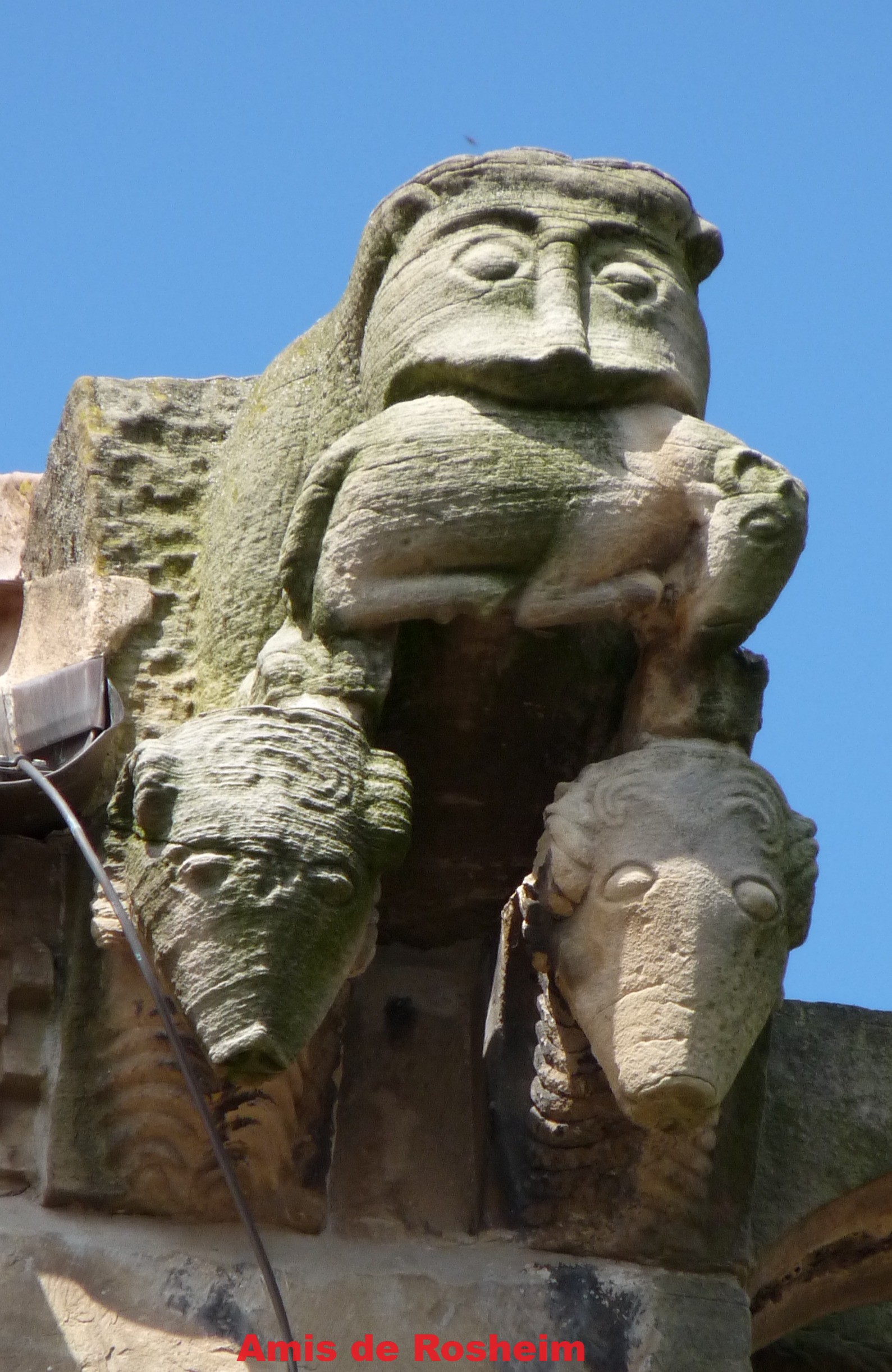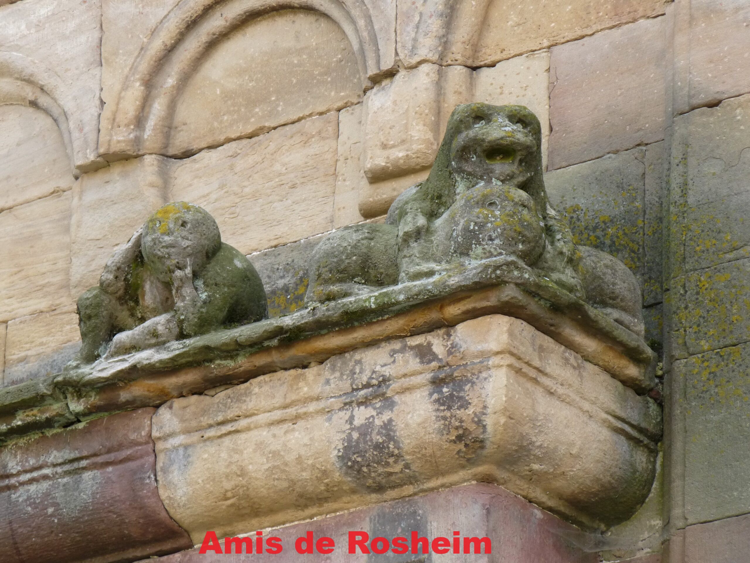 3 : De part et d’autre du pignon du croisillon nord des sculptures représentant des lions dévorant leur proie. Ici celle de l’acrotère nord-est : un lion dévore un agneau au-dessus de deux têtes de béliers en haut relief aux belles cornes torsadées.