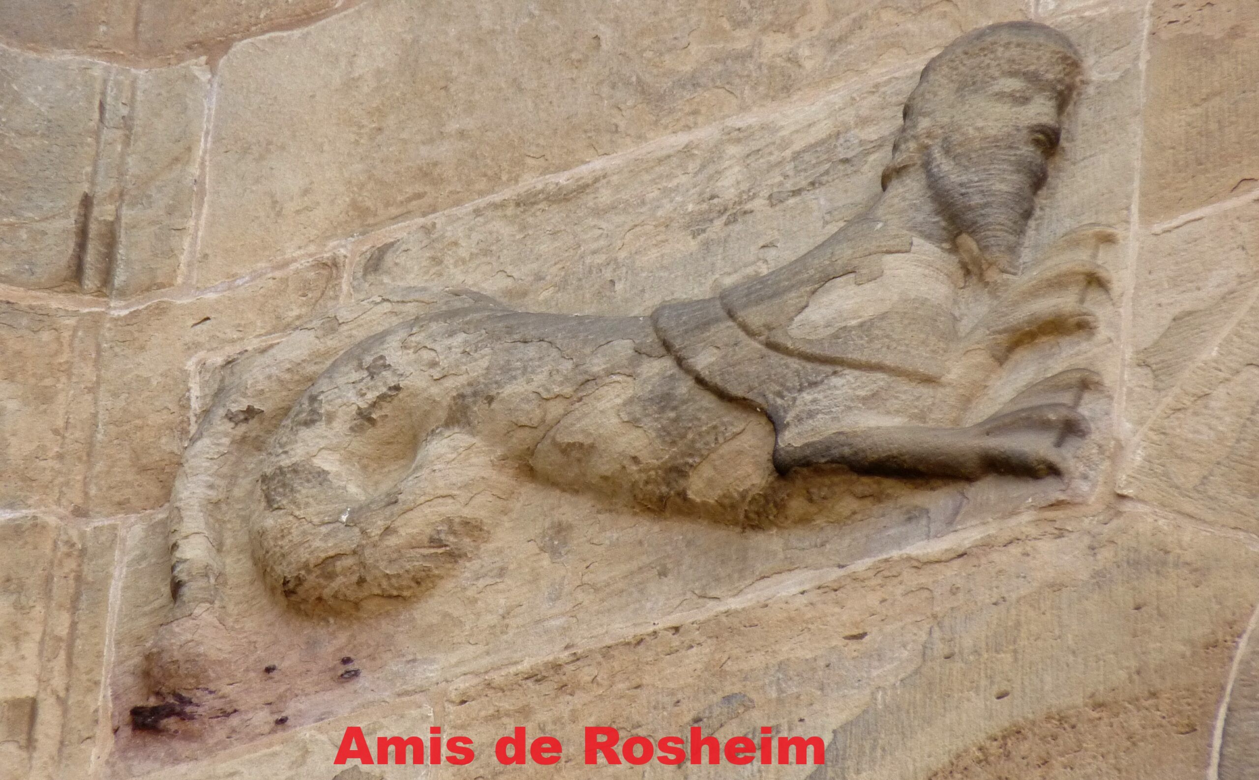 6 – Sur la première travée de la nef centrale du mur nord, ce curieux animal pourrait faire penser au capricorne du zodiaque : buste humain (tête barbue, cape sur les épaules), pattes palmées et queue de serpent, ou bien à un sphynx, symbolisant la force et l’intelligence.