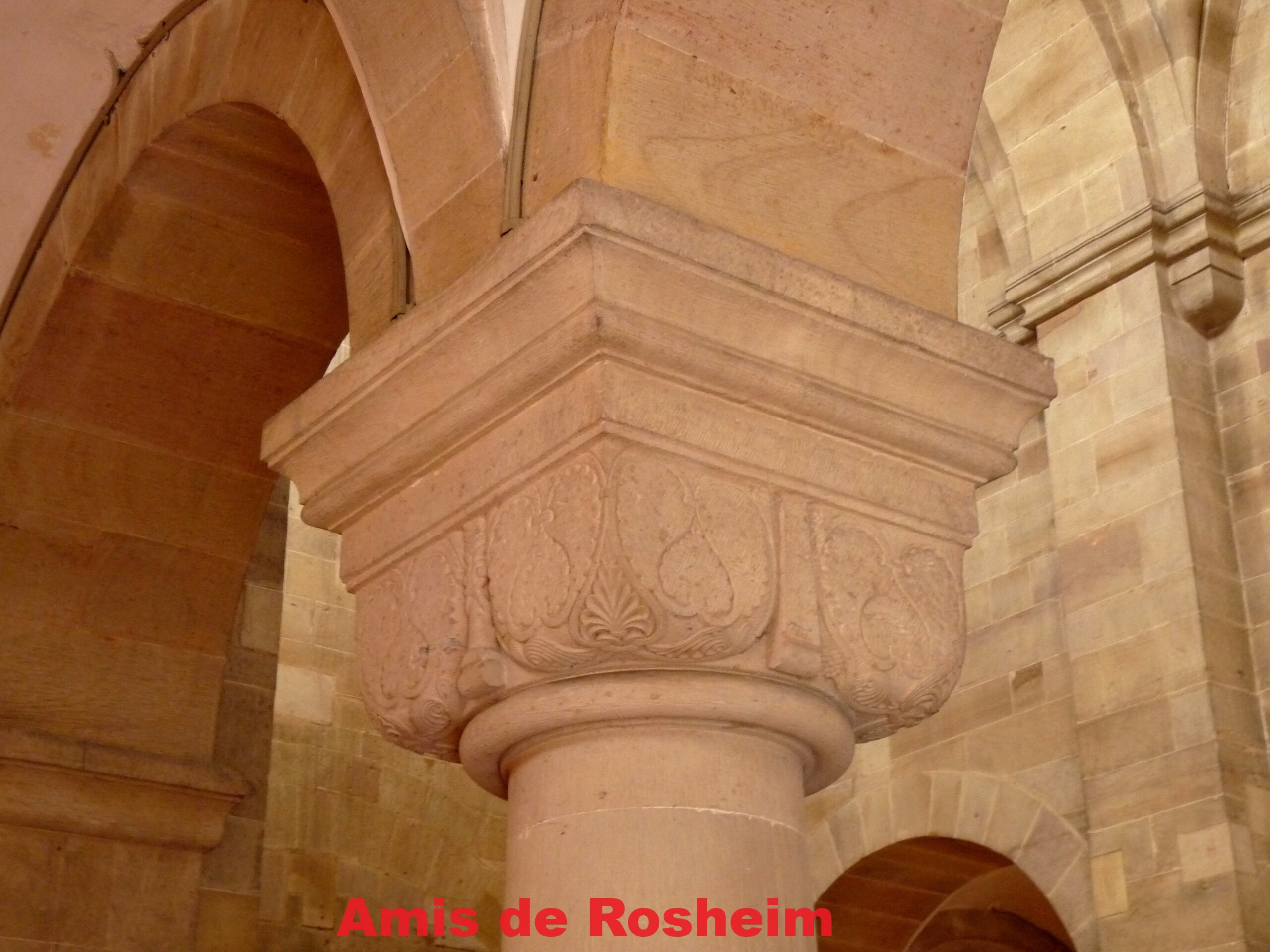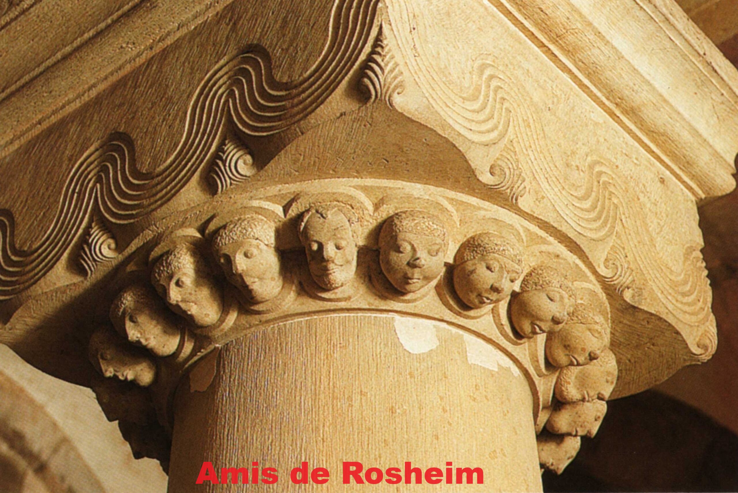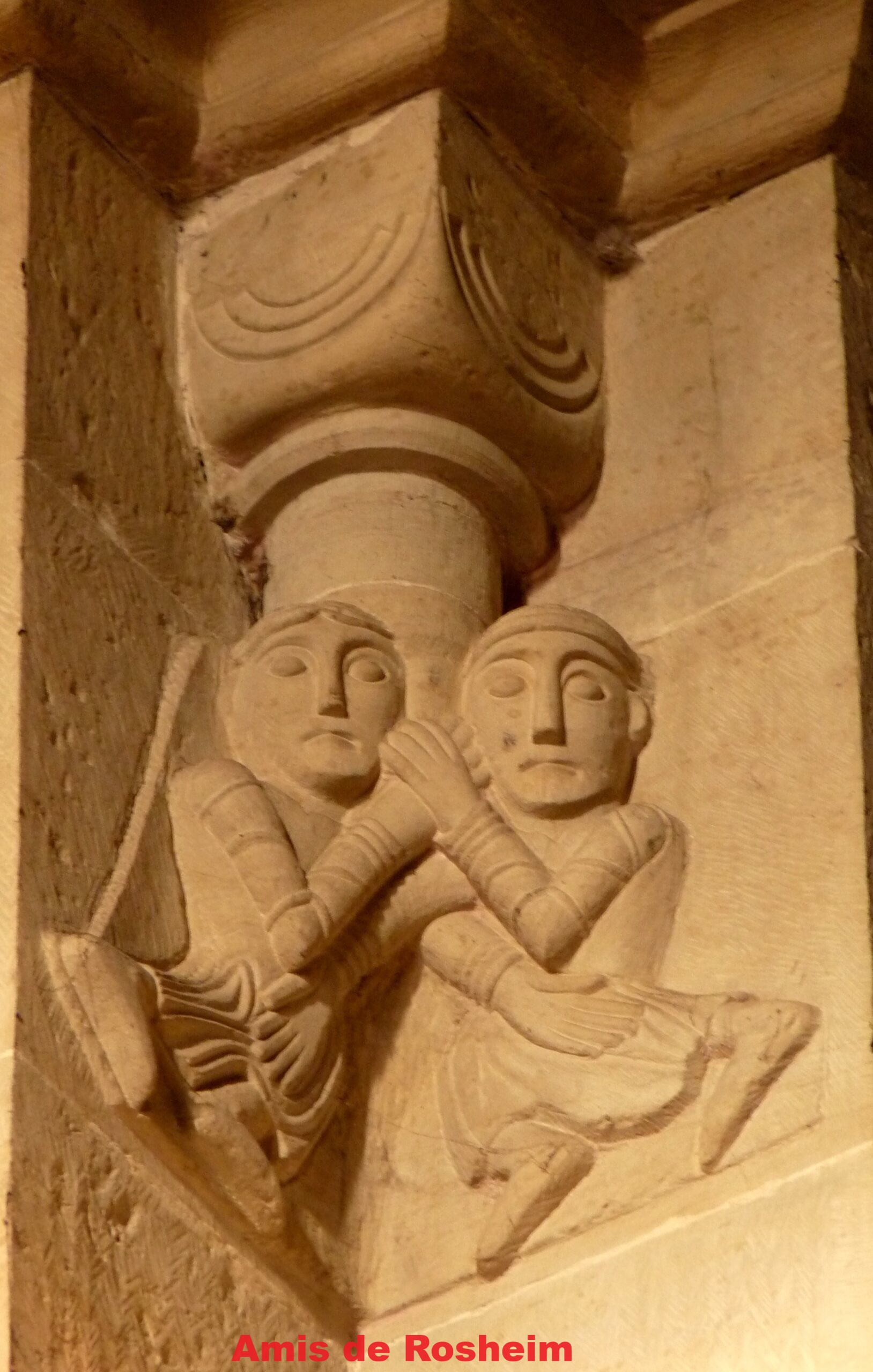 1-2 : Le chapiteau de la dernière colonne nord-est : chapiteau des têtes, une remarquable astragale composée de 21 têtes auréolées, toutes différentes. C’est l’œuvre d’un sculpteur physionomiste qui, le premier en Alsace, exécuta des têtes humaines dotées d’une expression naturelle et vivante. Au-delà de la stylisation des traits (yeux globuleux, pommettes saillantes, nez proéminent), on remarque que l’on se trouve devant de vrais portraits, si l’on examine plus attentivement chaque tête. Ces personnages (des saints ?) offrent des visages sereins, pacifiés et même parfois joyeux, au regard intériorisé.