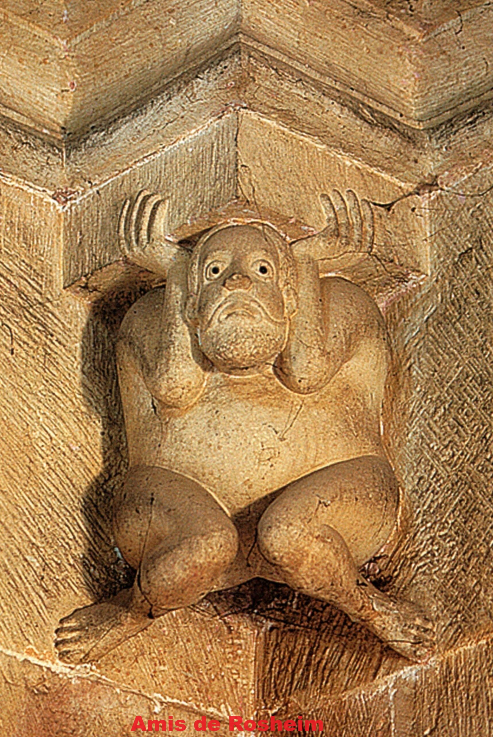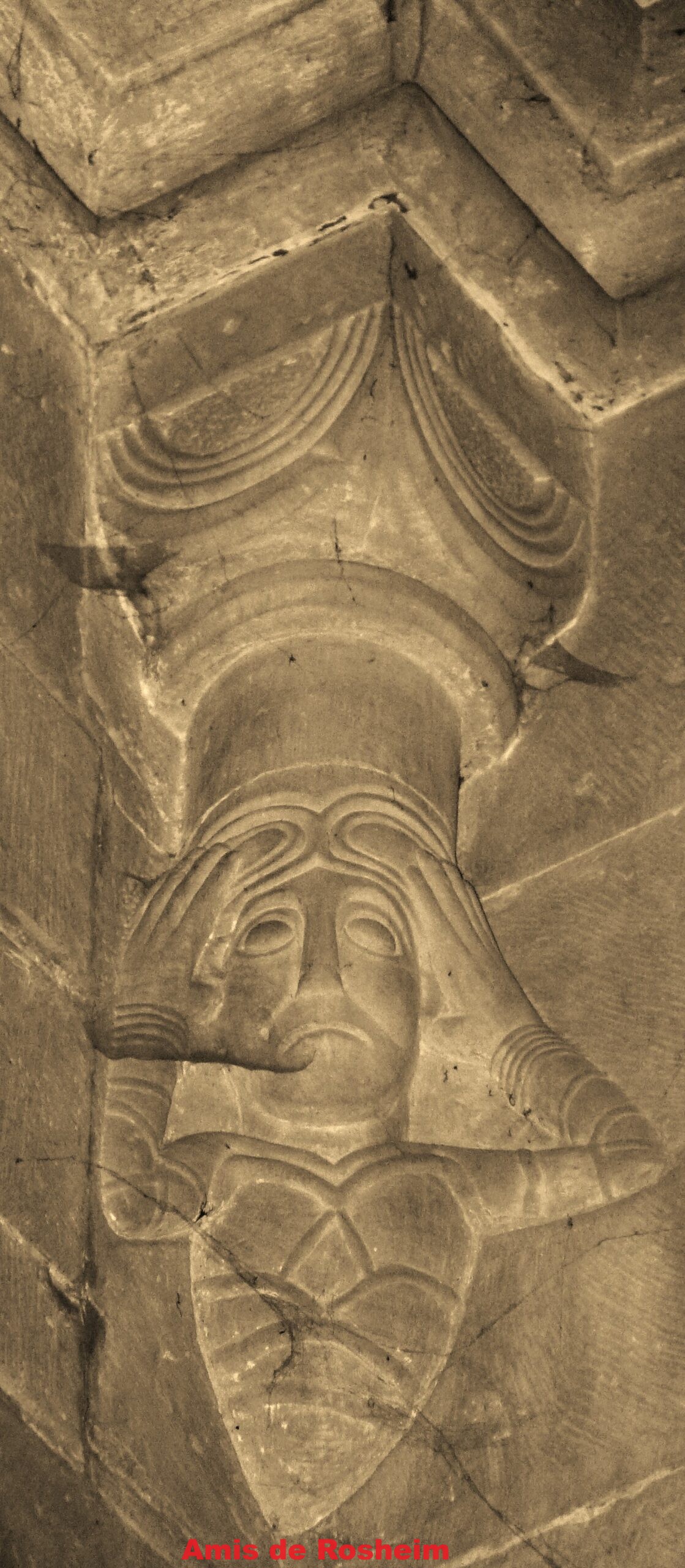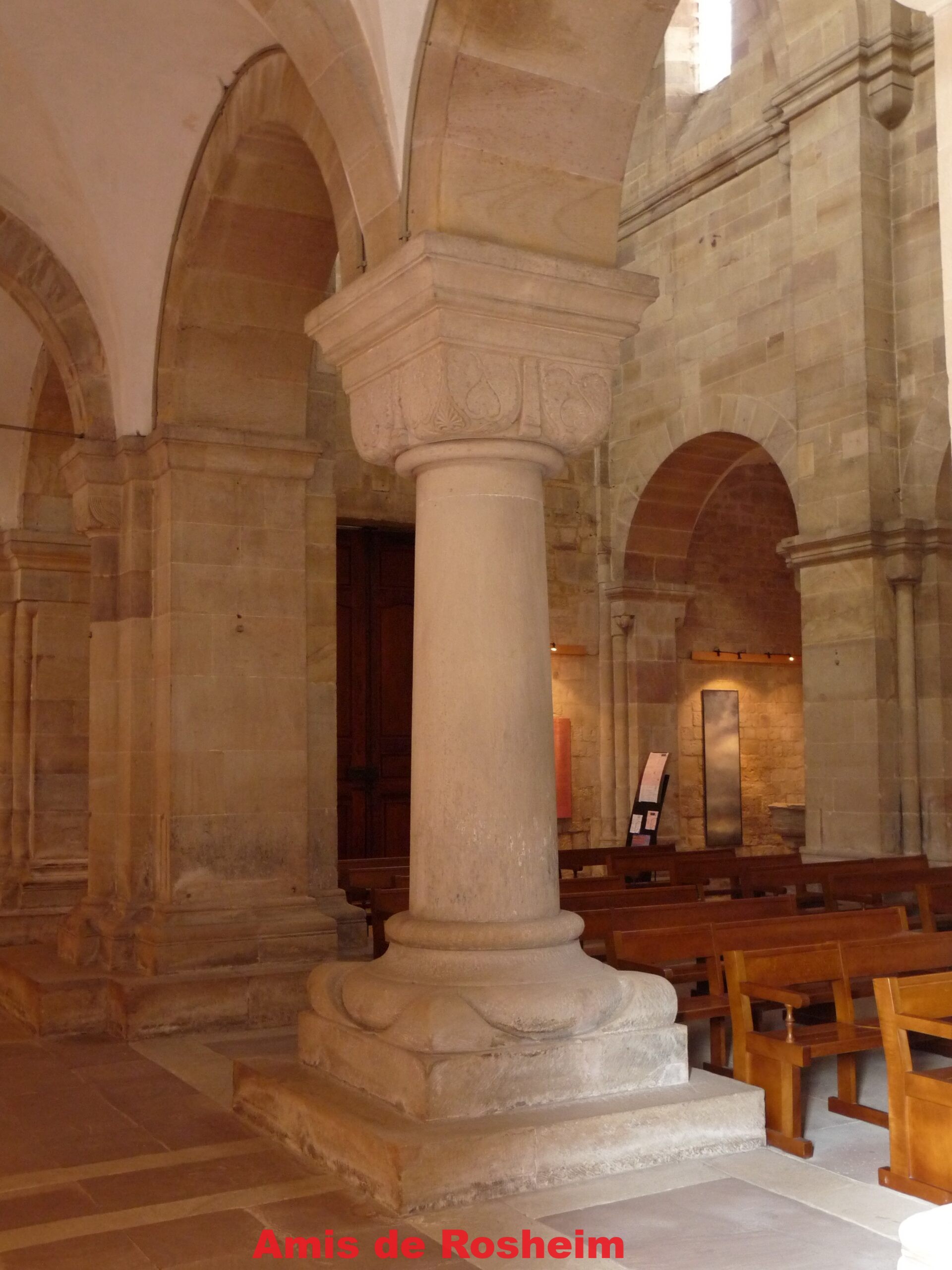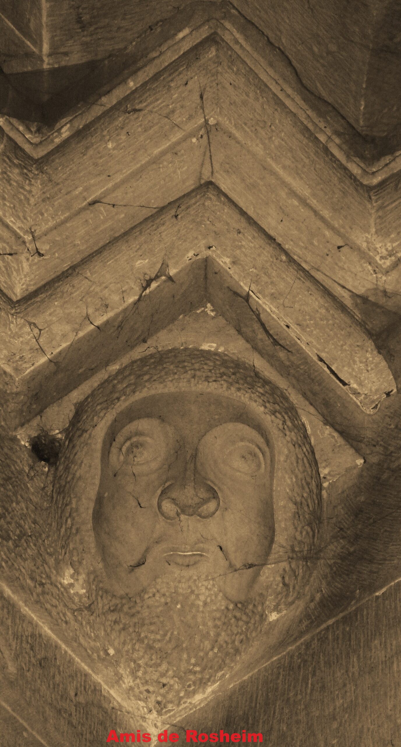 1-2 : Le chapiteau de la dernière colonne nord-est : chapiteau des têtes, une remarquable astragale composée de 21 têtes auréolées, toutes différentes. C’est l’œuvre d’un sculpteur physionomiste qui, le premier en Alsace, exécuta des têtes humaines dotées d’une expression naturelle et vivante. Au-delà de la stylisation des traits (yeux globuleux, pommettes saillantes, nez proéminent), on remarque que l’on se trouve devant de vrais portraits, si l’on examine plus attentivement chaque tête. Ces personnages (des saints ?) offrent des visages sereins, pacifiés et même parfois joyeux, au regard intériorisé.