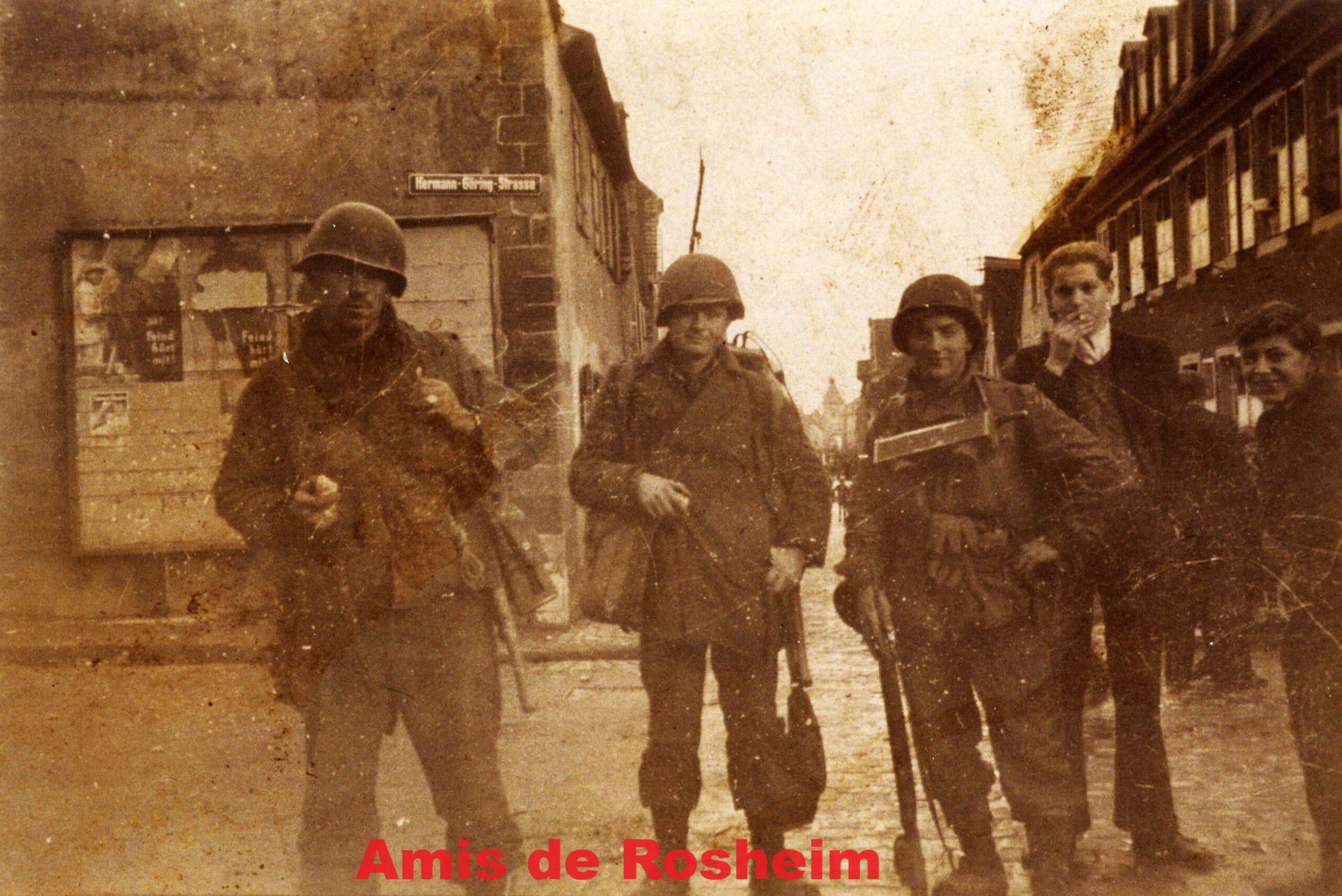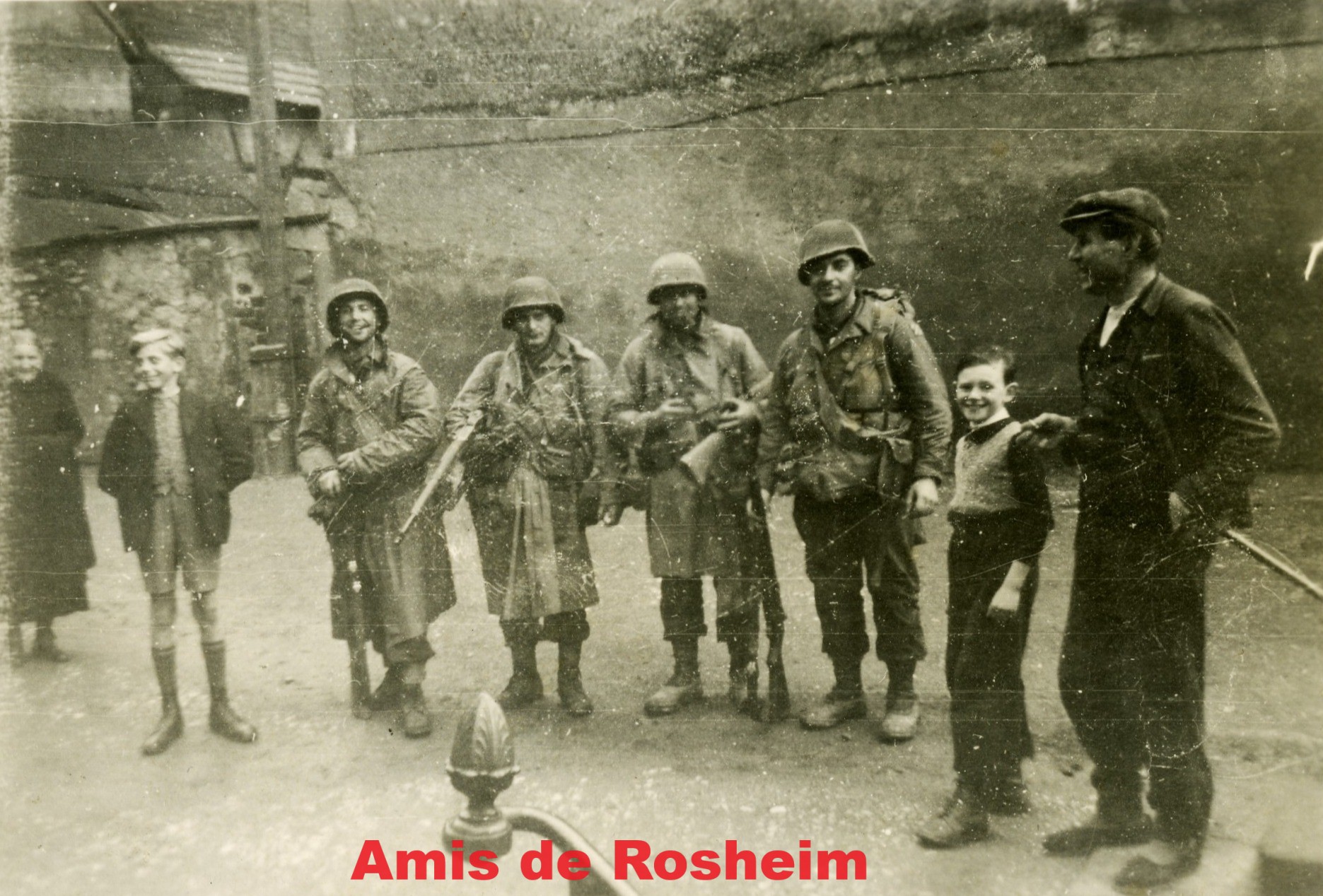 7 – 15h : la liesse s’empare de Rosheim ! Les gens sortent dans la rue pour accueillir les soldats. Les échanges s’amorcent : vin alsacien et schnaps contre chocolat et chewing-gums. Rosheim est libérée ! Un groupe de soldat photographiés derrière l’église St-Etienne par l’abbé Dussourd.