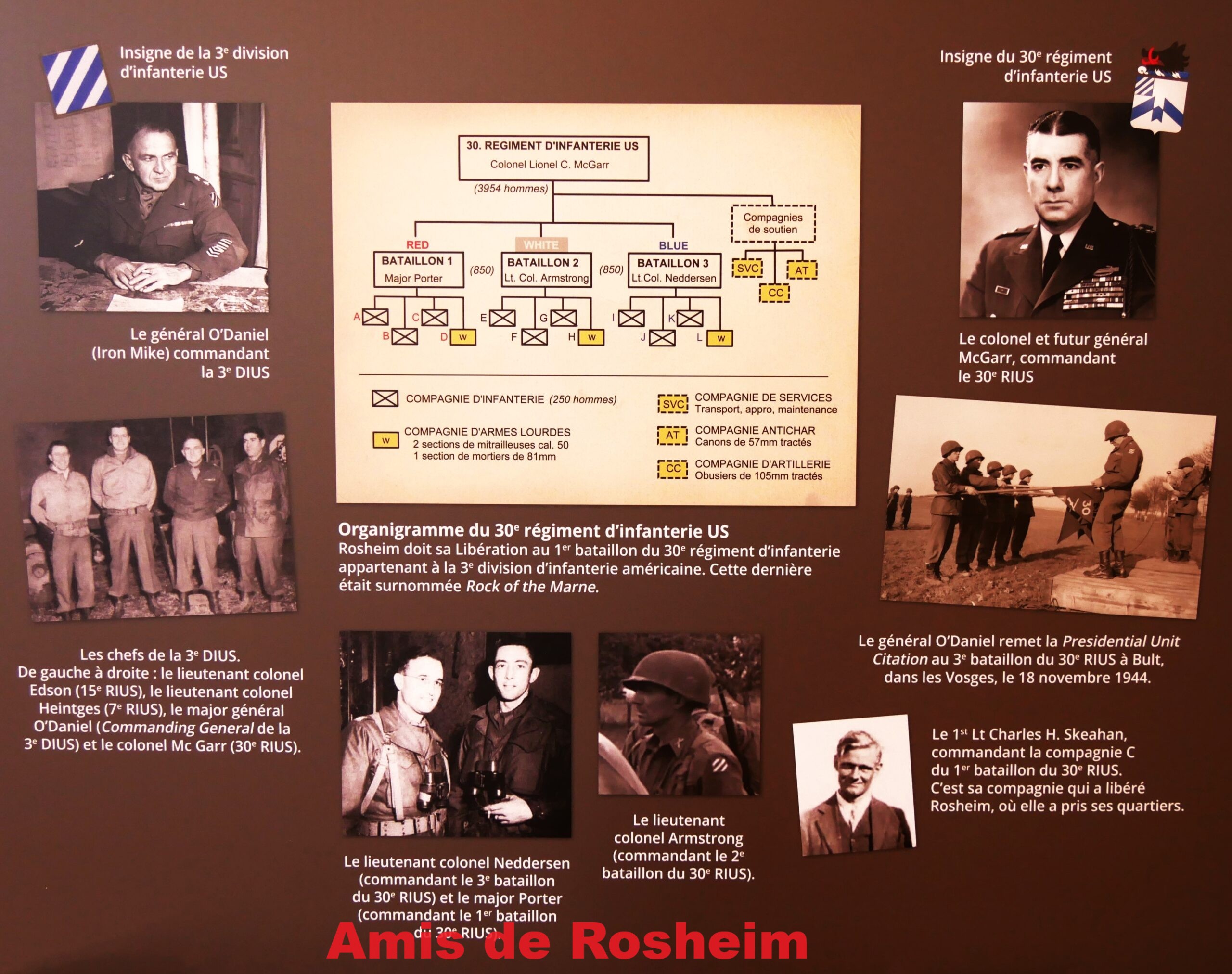 2 – Nos libérateurs : Le général O’Daniel (Iron Mike) commandant de la 3e Division d’Infanterie (DIUS) US, le colonel (puis général) McGarr commandant le 30e Régiment d’Infanterie (RIUS), le major Porter commandant le 1e bataillon du 30e RIUS et le Lieutenant Skeahan commandant de la compagnie C du 1e bataillon du 30e RIUS qui a libéré Rosheim.