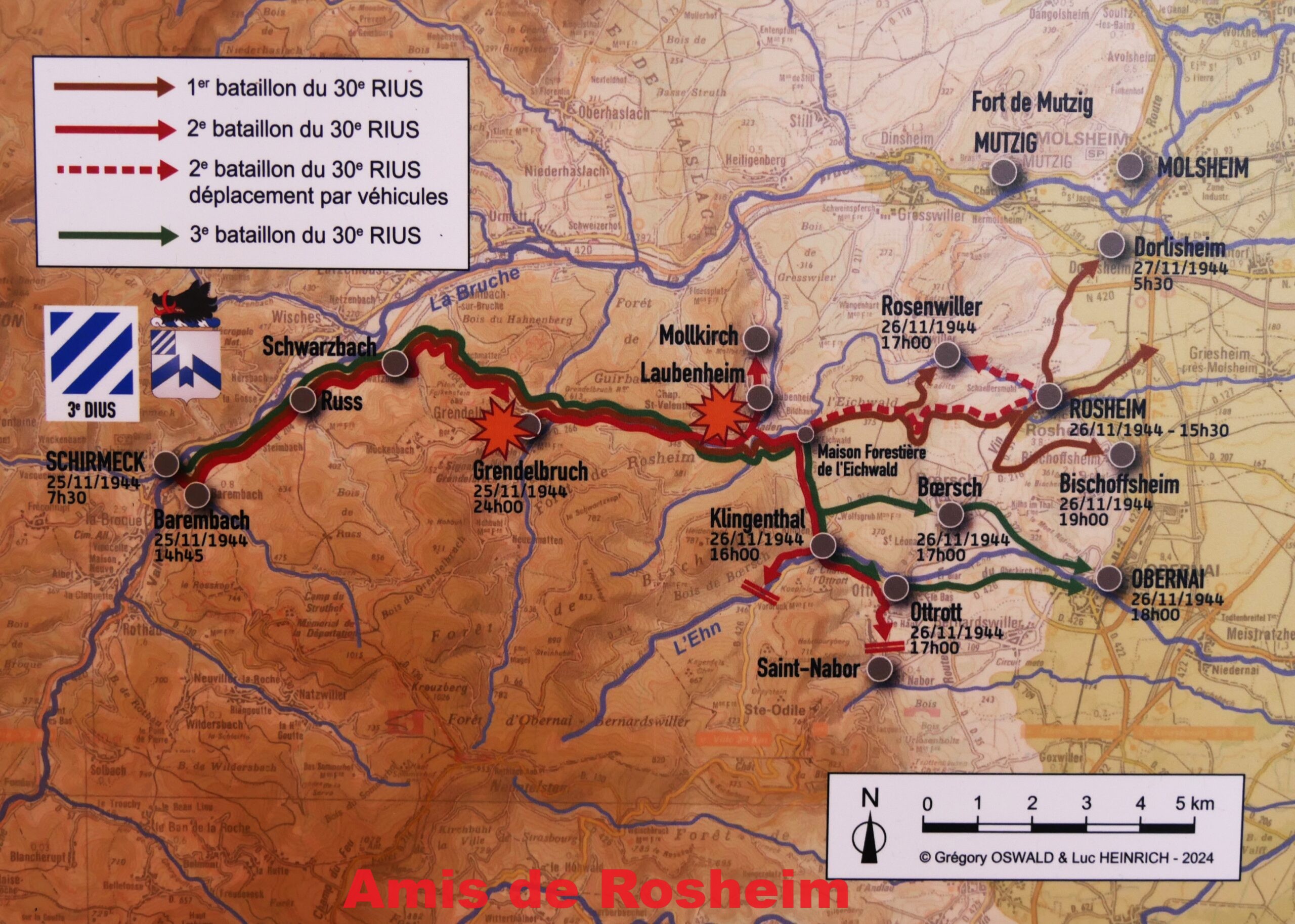 3 – Grendelbruch a été libérée, après une nuit de combats, la voie est libre, dans la matinée du 26 novembre 1944, les troupes américaines peuvent continuer leur progression vers l’Est, en direction de la plaine d’Alsace. A 10h30 elles arrivent au carrefour de l’Eichwald. Les 3 bataillons du 30e régiment d’infanterie se répartissent sur 3 secteurs différents. Le 1er bataillon prend la direction de Rosheim, se frayant un passage au milieu des secteurs minés de la forêt environnante.