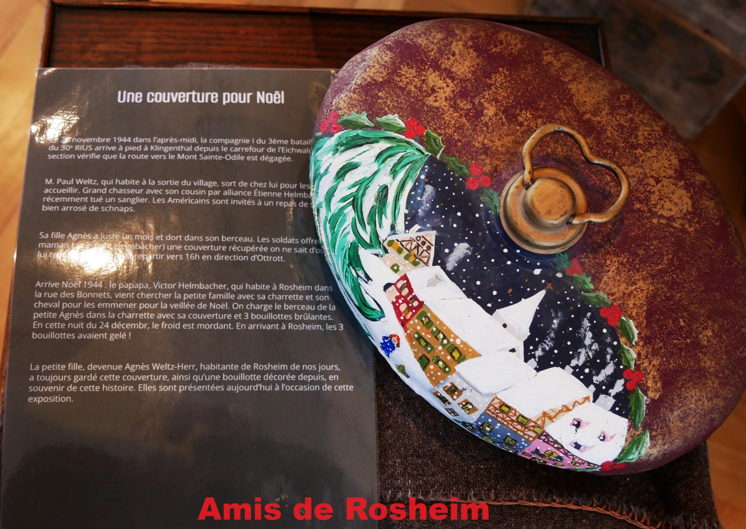 6 – La couverture et une bouillote décorée en mémoire d’un épisode de Noël 1944, où la petite Agnès, tout juste un an, a pu bénéficier d’une couverture offerte par les Américains du 30e RIUS après un repas au sanglier arrosé de schnaps. Cette couverture et 3 bouillottes permettront de la protéger du froid lors de son déplacement en charrette de Klingenthal à Rosheim pour participer à la veillée de Noël chez son grand père.
