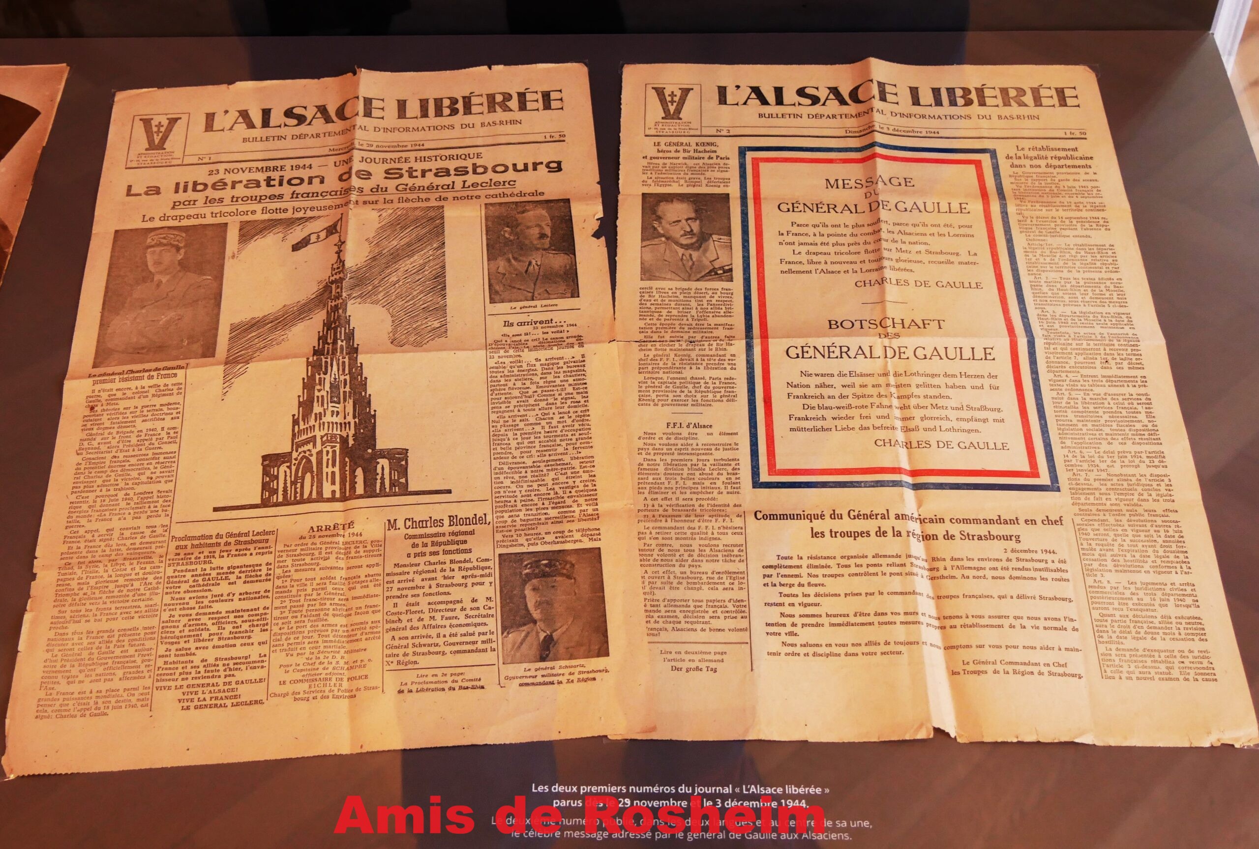 8 – Les 2 premiers numéros du journal « L’Alsace Libérée » parus les 29 novembre et 3 décembre 1944 avec sur le deuxième numéro, le message du Général de Gaulle aux Alsaciens.